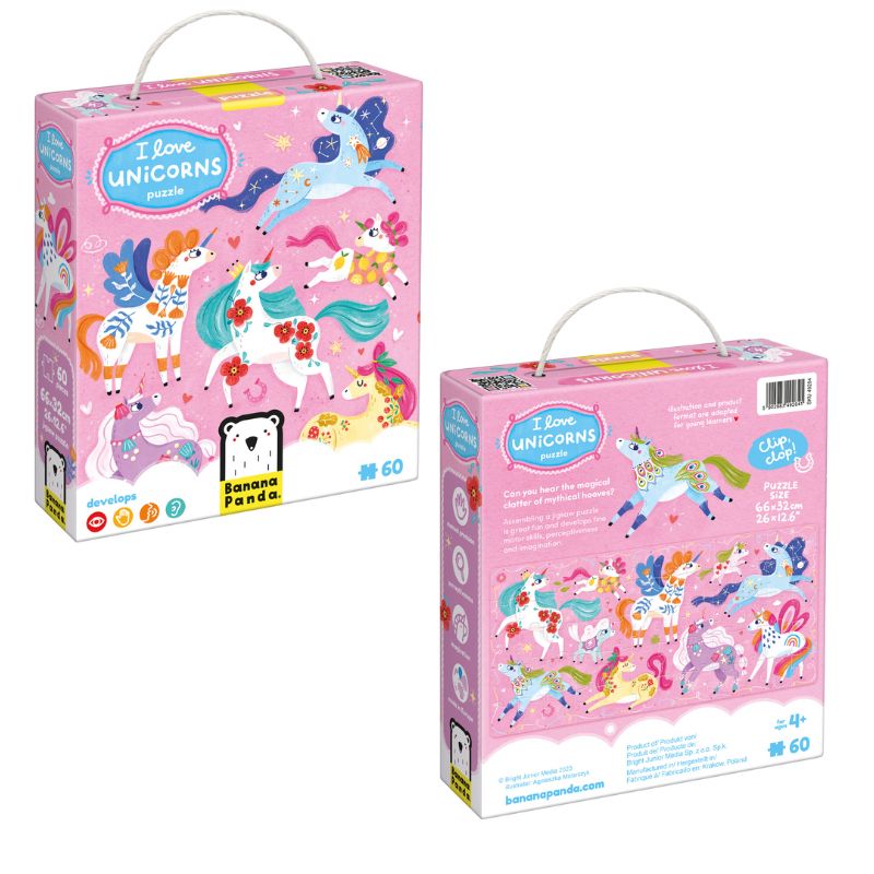 Perfect for preschoolers, Banana Panda's I Love Unicorns Puzzle set contains 60 vibrant puzzle pieces that create a fun unicorn scene.
