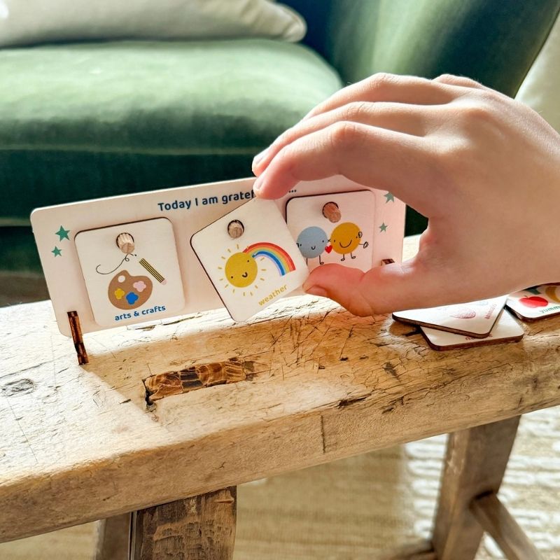 Lovingly hand crafted from wood, this fabulous set features 15 gratitude cards that your little one can choose from each day and display on the gratitude chart. Meant to inspire children to understand things in their lives that make them happy, appreciation and to encourage mindfulness, being aware of their thoughts and feelings.