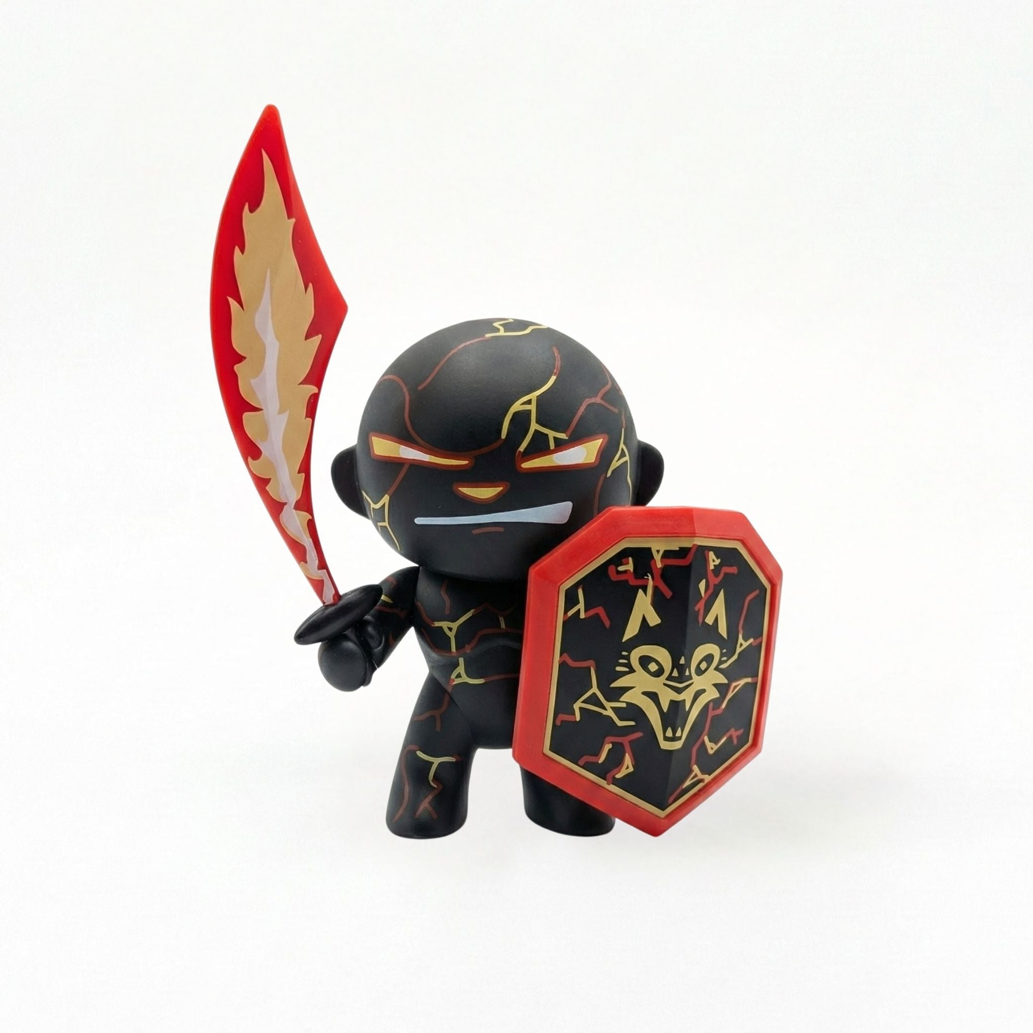 Volcano more than lives up to his name with a blazing personality and a temper that erupts without warning. This flame warrior carries a scorching fire deep inside that fuels his fury against rivals. With his blazing sword and red hot shield in hand, Volcano sends anyone who dares to approach him running in fear of being burnt. His passion burns so hot that steam pours from his ears and nose as he stands always ready for a fight to protect the honour of his village.