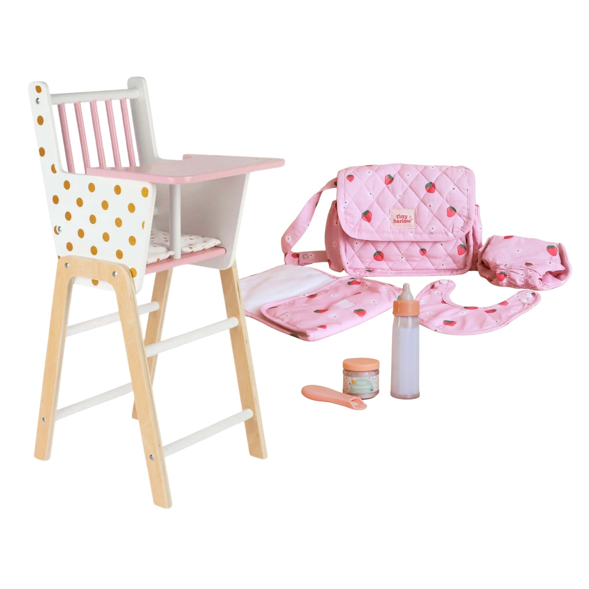 It's dinner time! Save with this doll weaning bundle; contains everything you need to feed dolly. Sit your doll in the cute pink highchair, pop their bib on and feed them a jar of Tiny Tummies Baby Cereal, watch as the cereal magically disappears from the spoon! Don't forget their magic milk and a quick nappy change after.