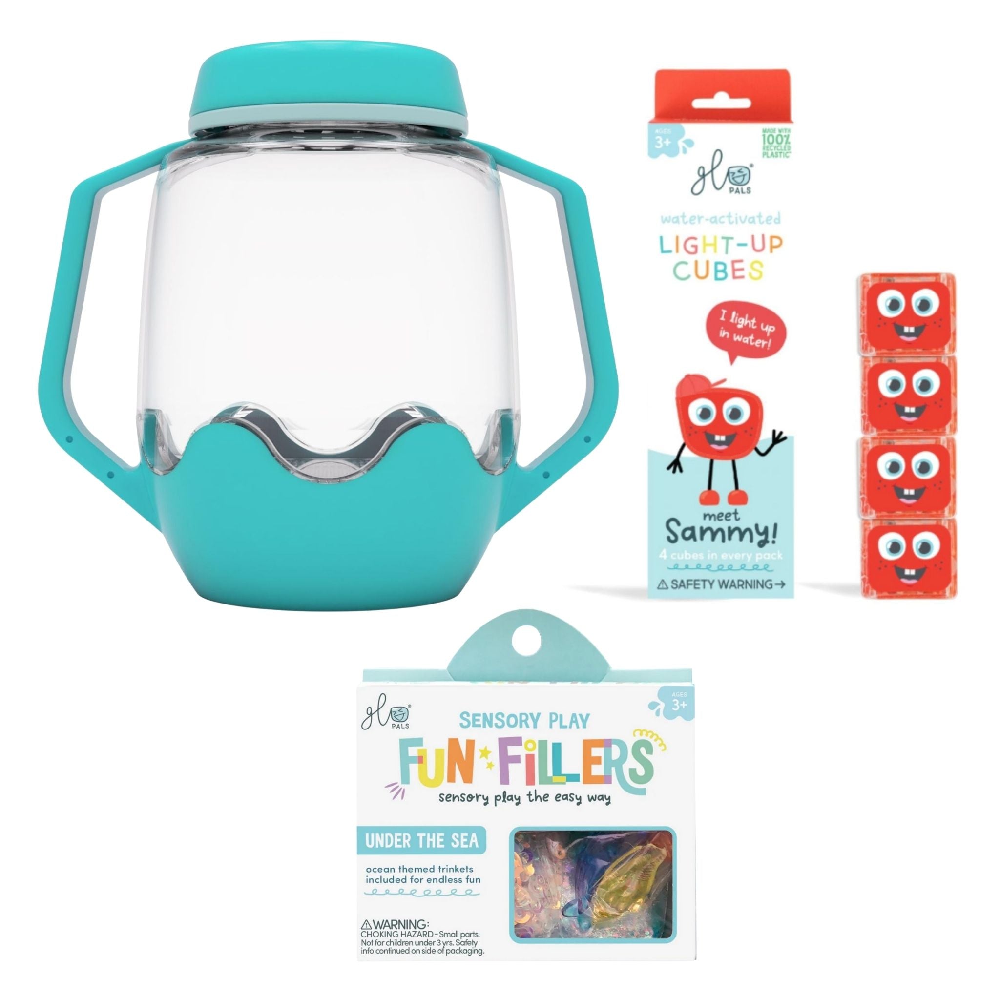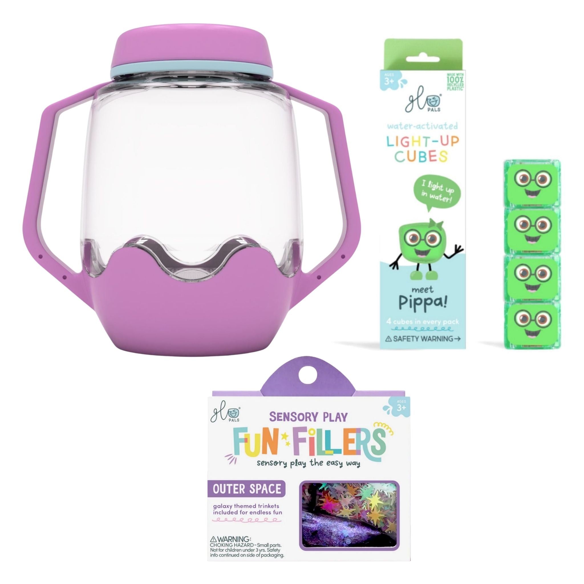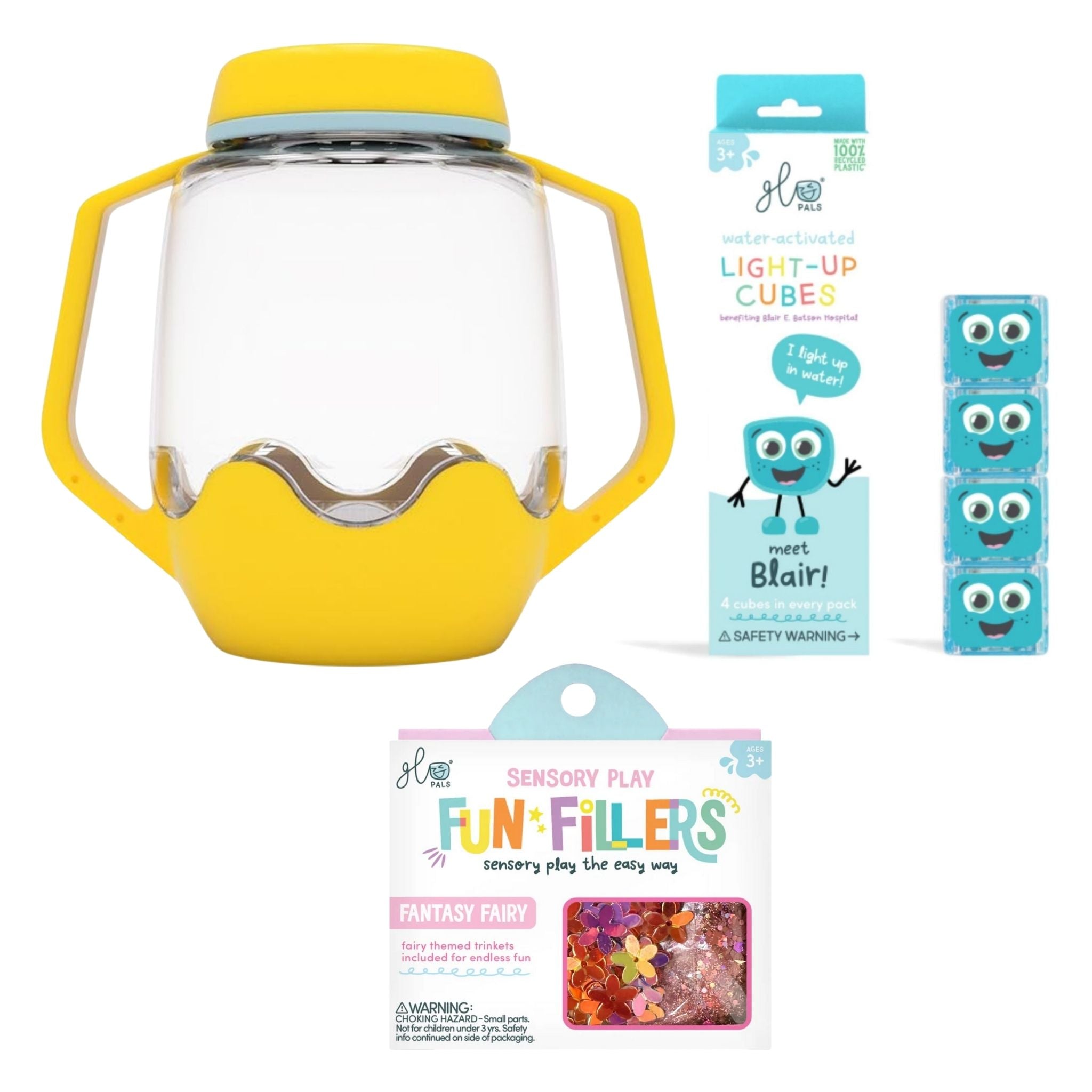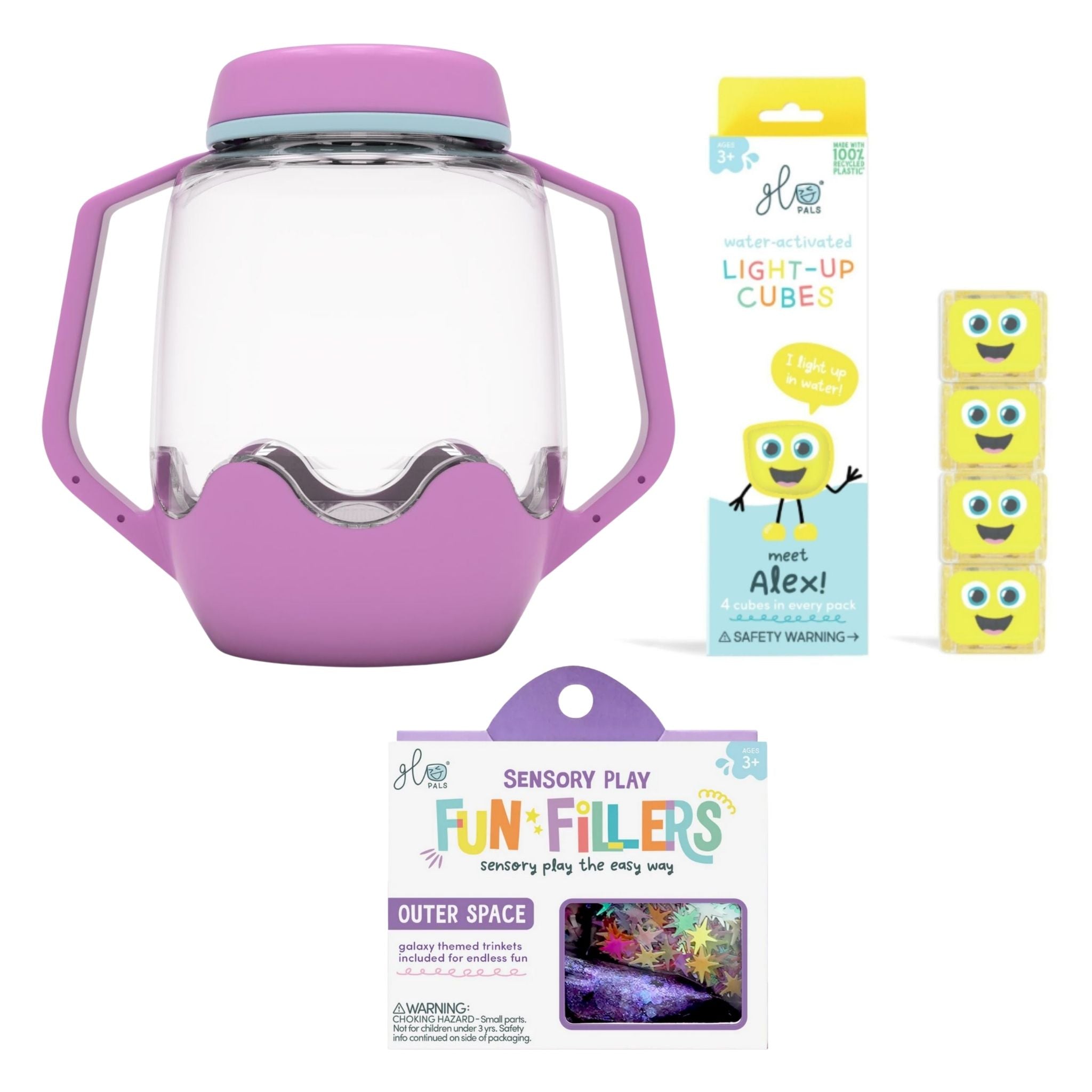 Create your own sensory jar with your very own colour combinations! Choose your jar, fun filler and for added glowing fun your favourite Glo Pals Light Up Cubes. The Sensory Play Jar lights up on its own when in contact with water, but you can add your Light Up Cubes for even more sensory fun, just remember to remove the cubes promptly after play time!