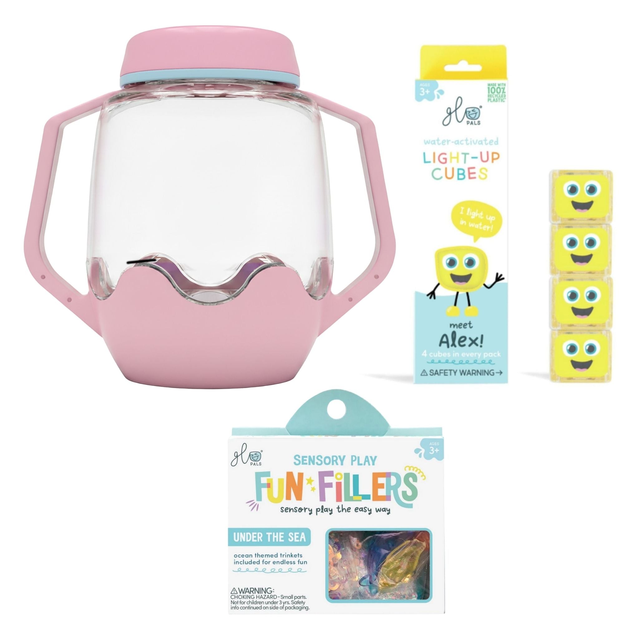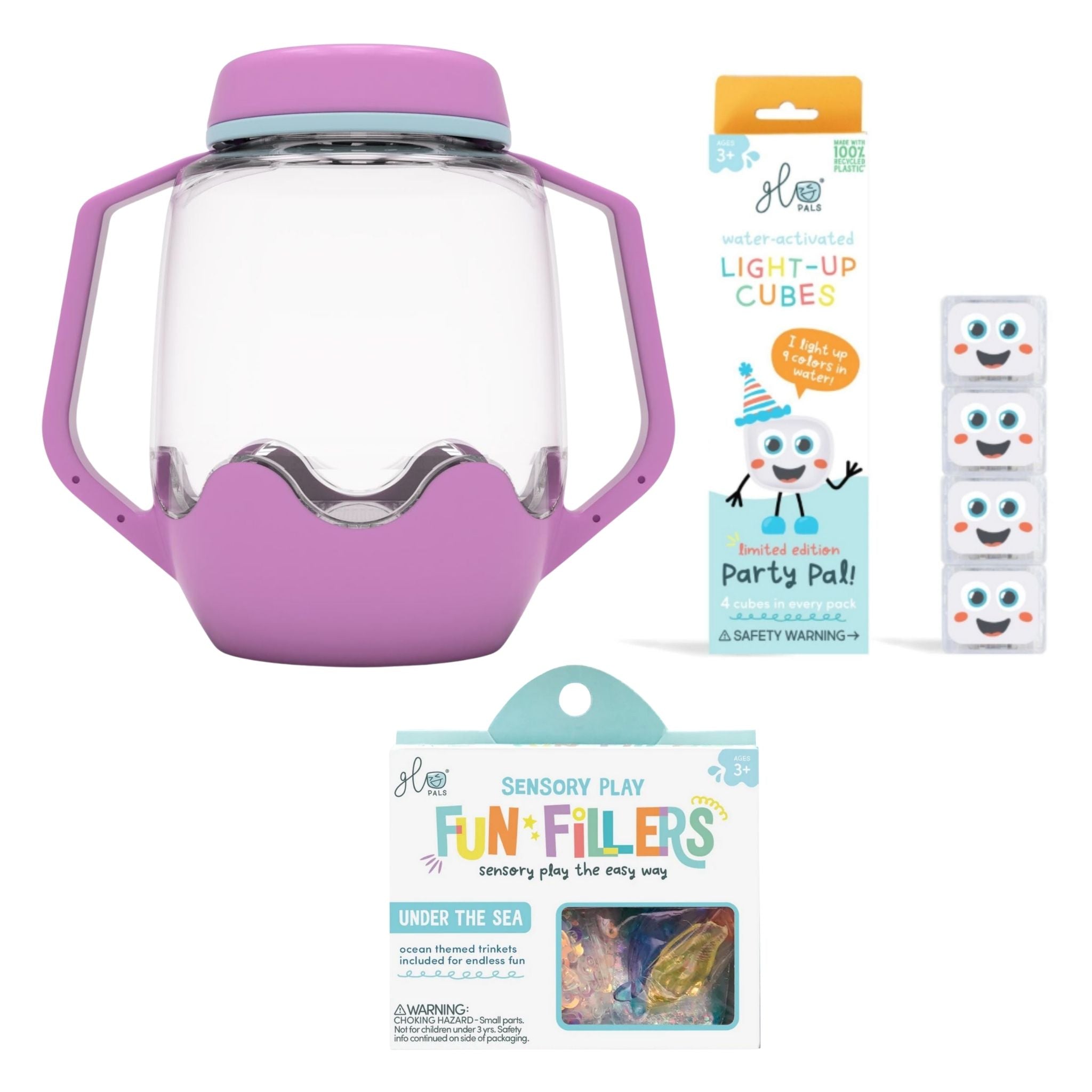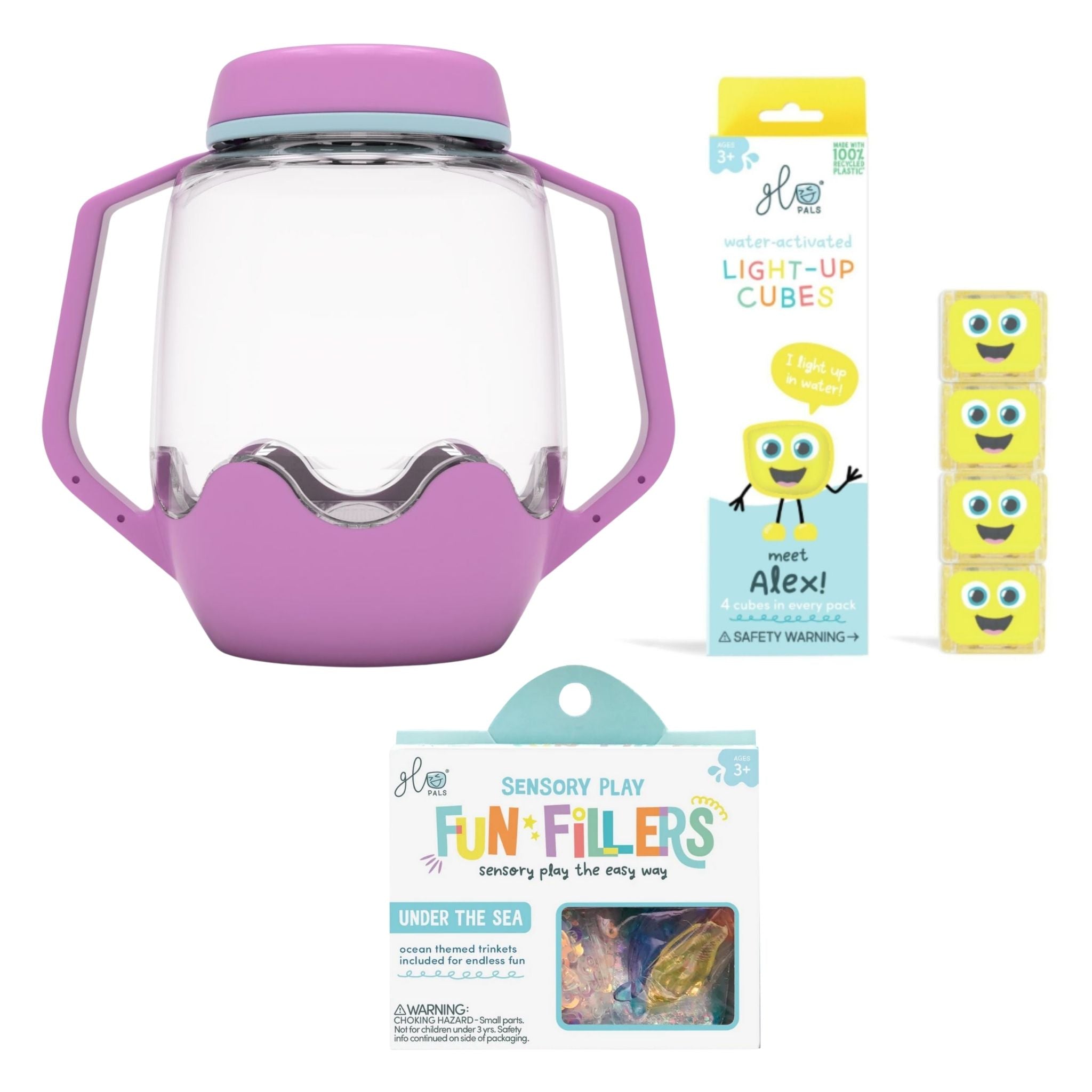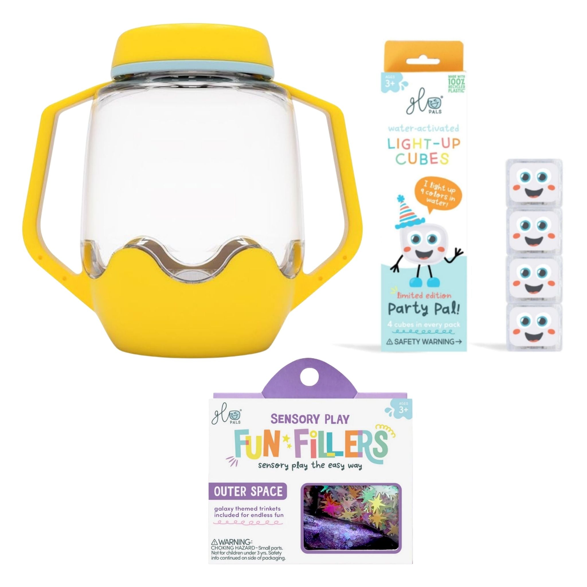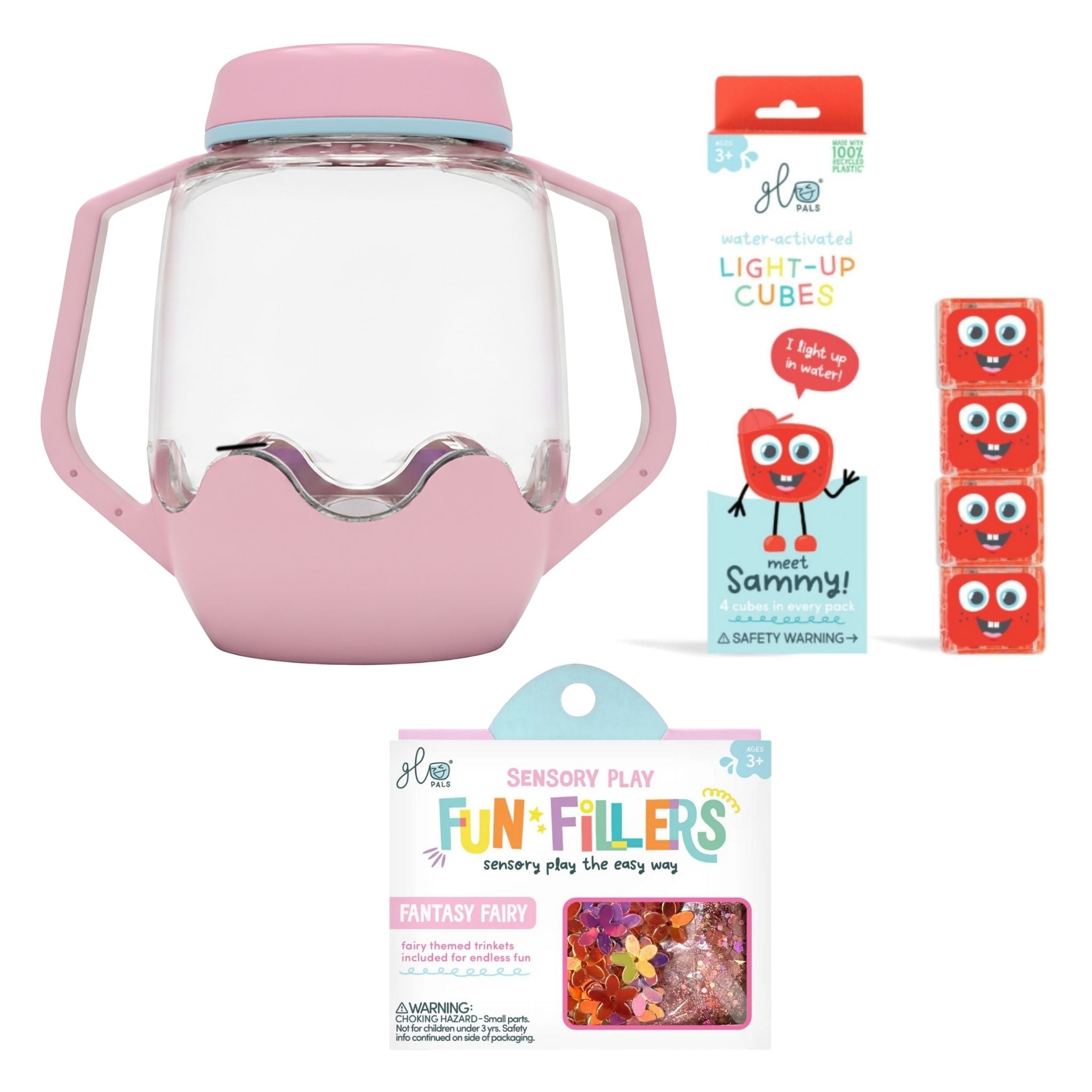 Create your own sensory jar with your very own colour combinations! Choose your jar, fun filler and for added glowing fun your favourite Glo Pals Light Up Cubes. The Sensory Play Jar lights up on its own when in contact with water, but you can add your Light Up Cubes for even more sensory fun, just remember to remove the cubes promptly after play time!