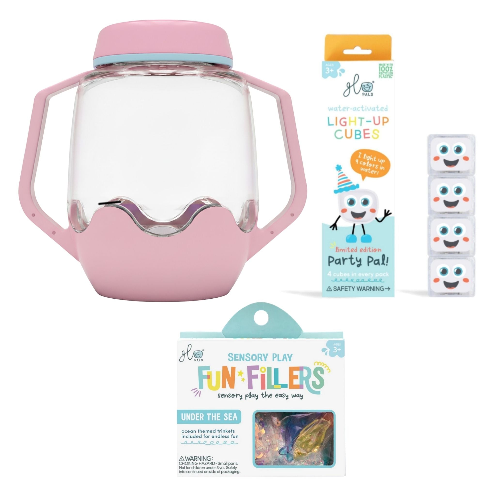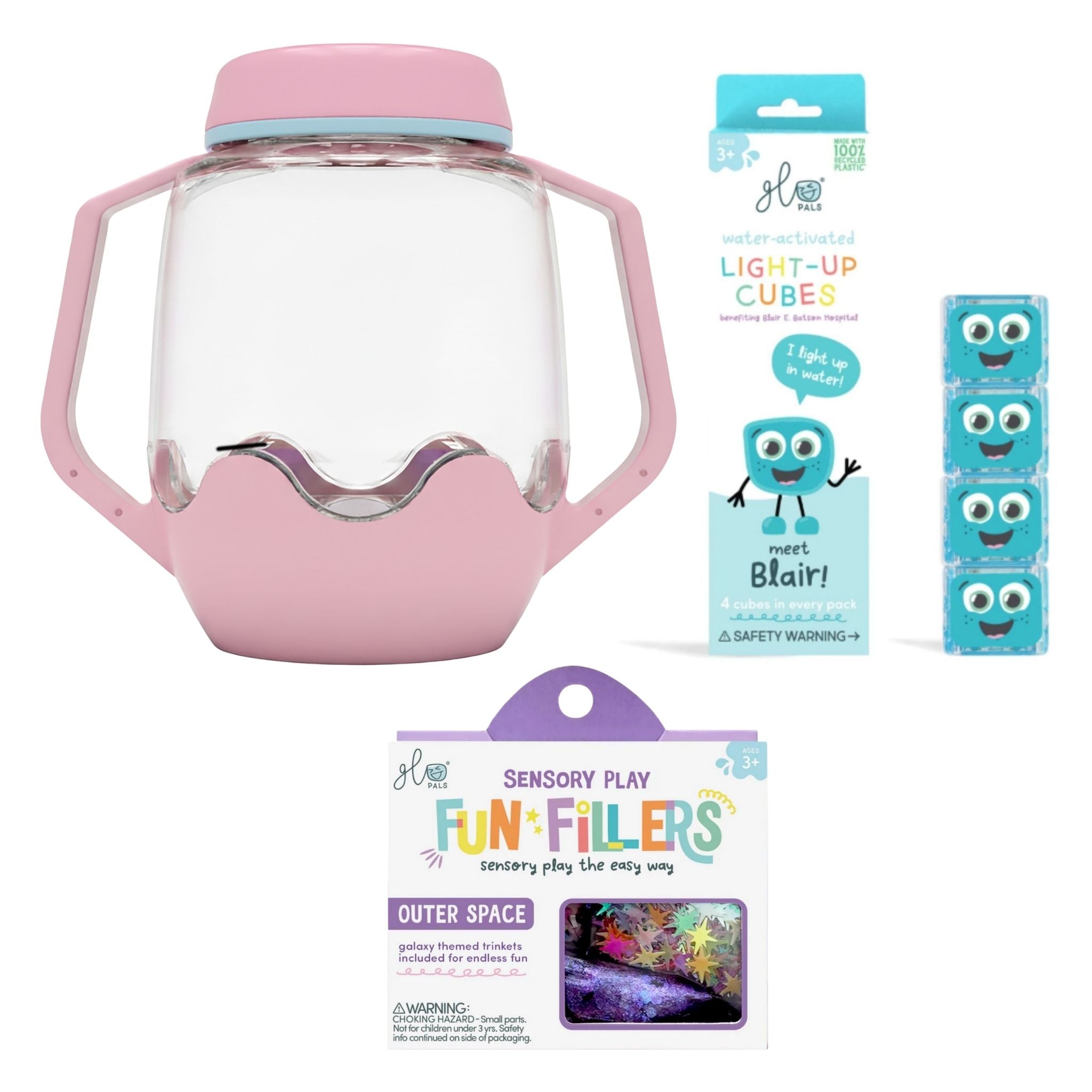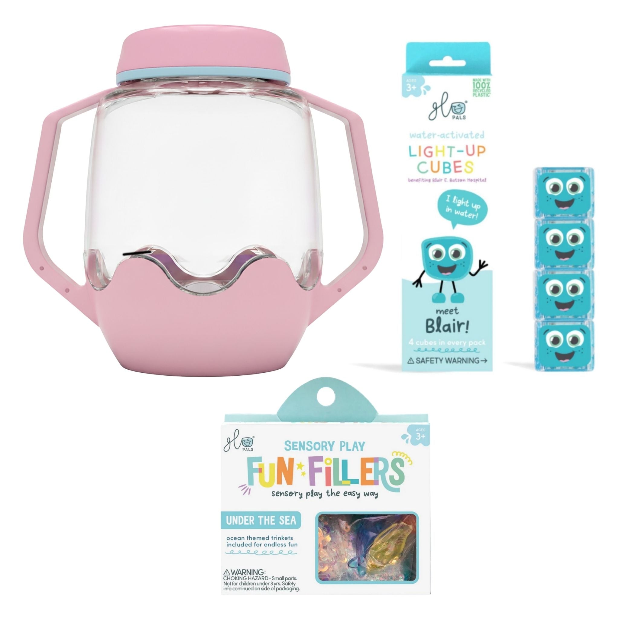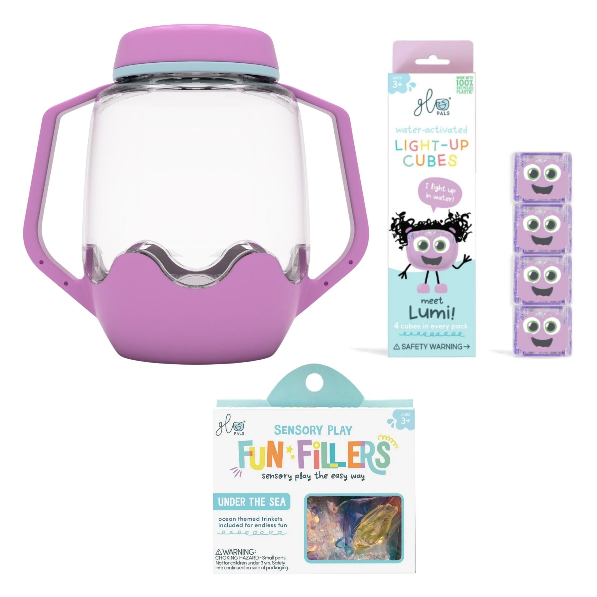 Create your own sensory jar with your very own colour combinations! Choose your jar, fun filler and for added glowing fun your favourite Glo Pals Light Up Cubes. The Sensory Play Jar lights up on its own when in contact with water, but you can add your Light Up Cubes for even more sensory fun, just remember to remove the cubes promptly after play time!
