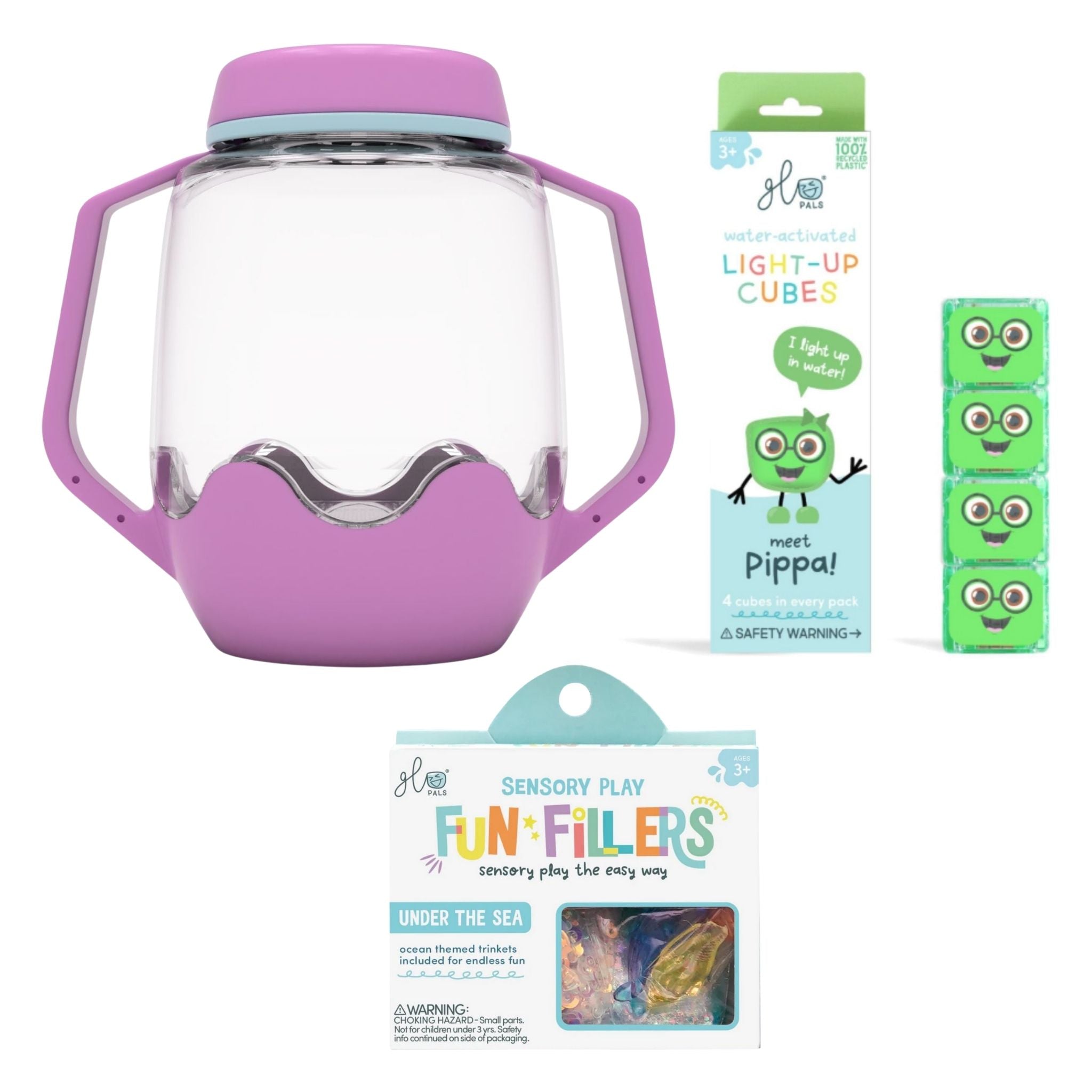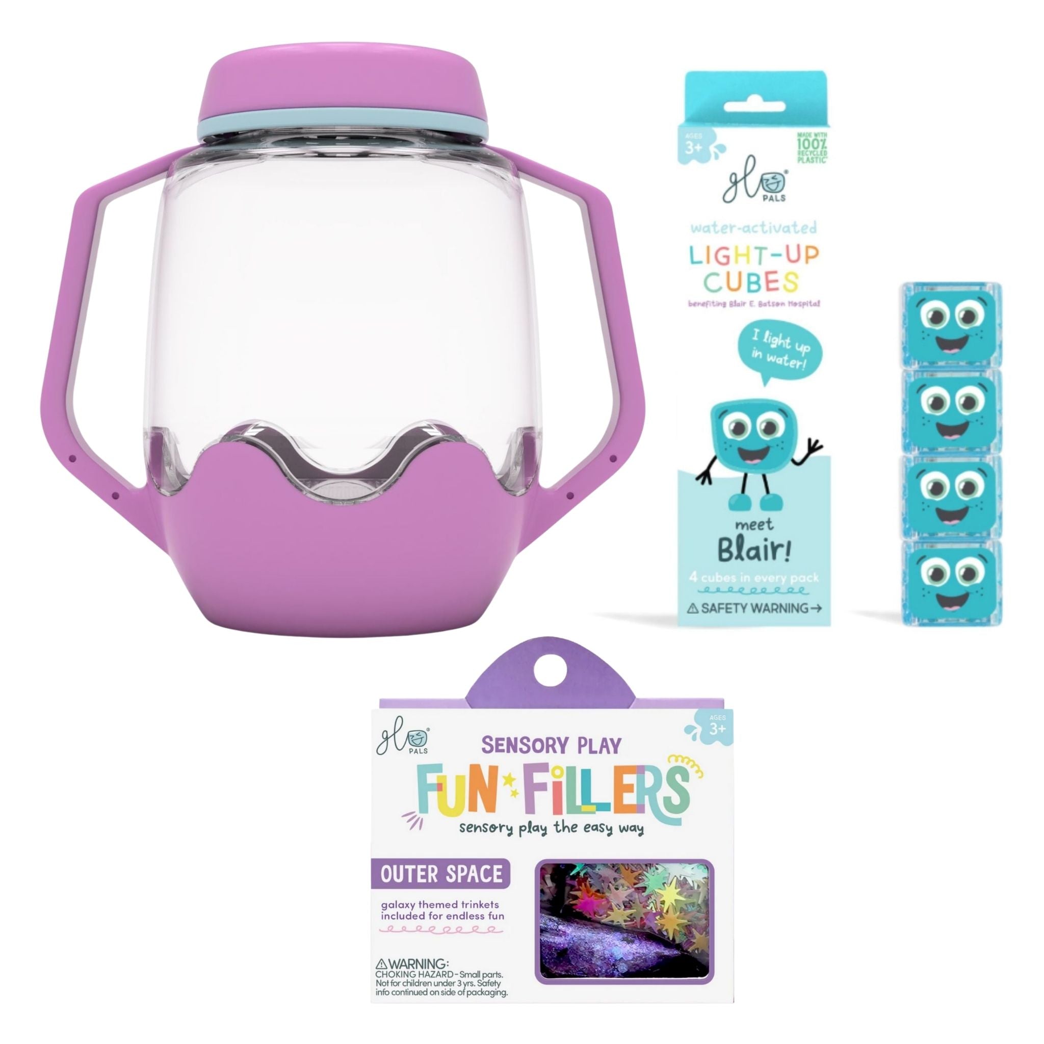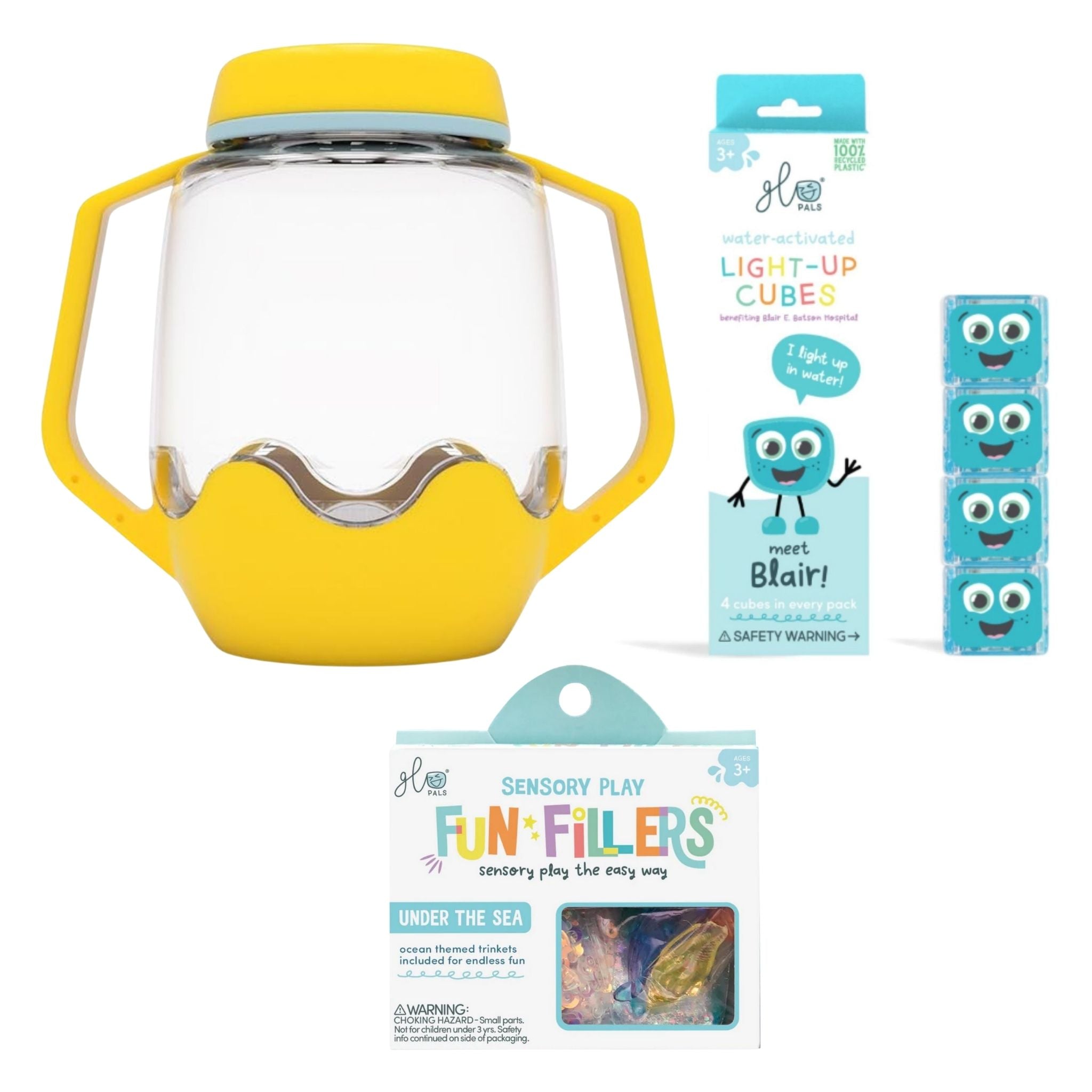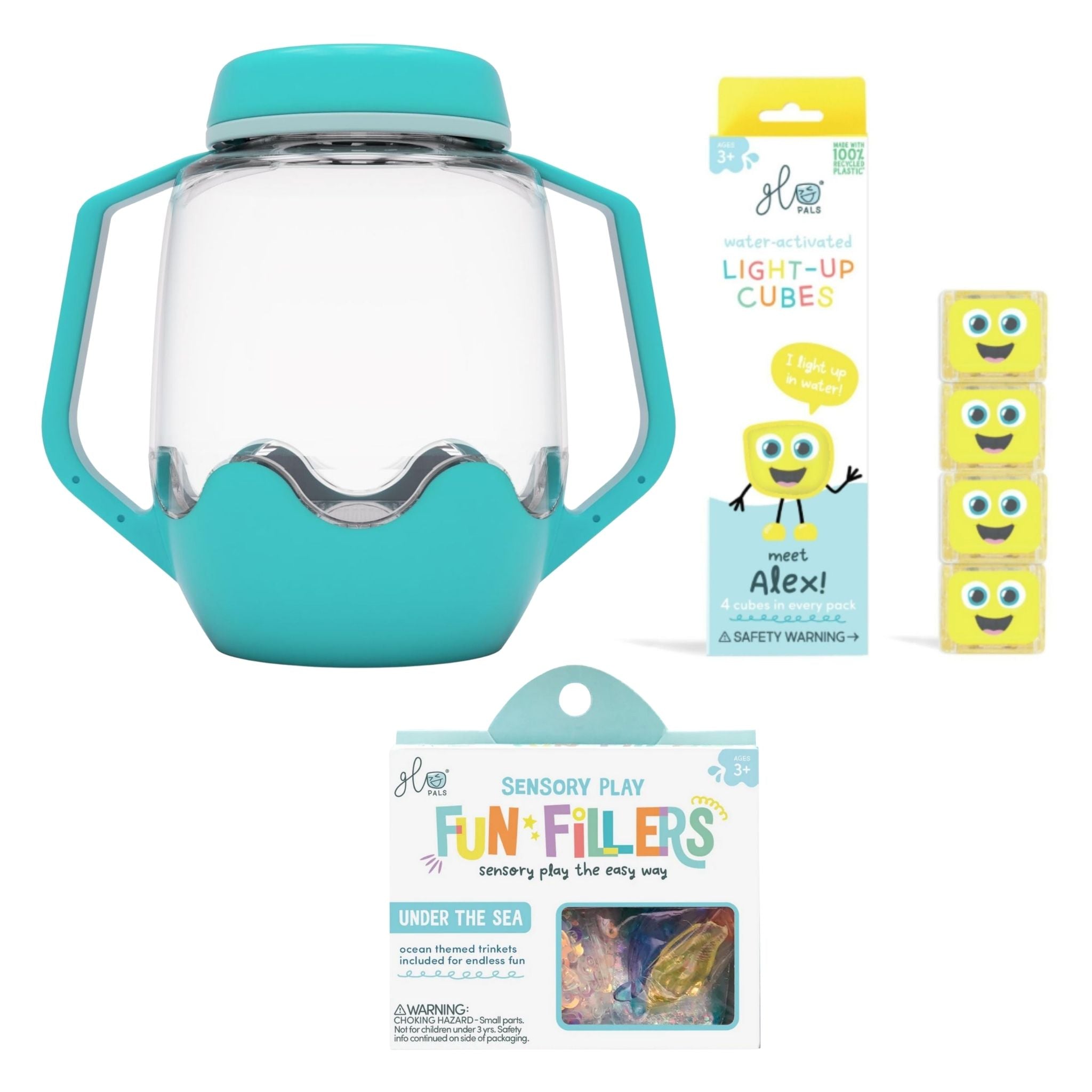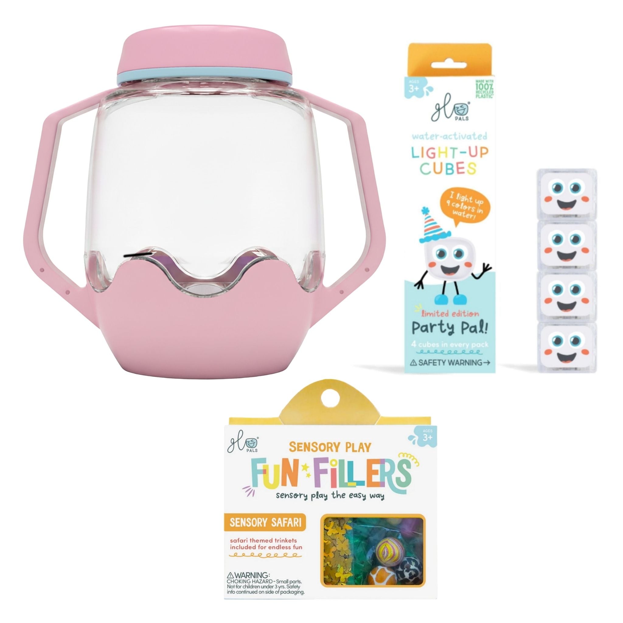 Create your own sensory jar with your very own colour combinations! Choose your jar, fun filler and for added glowing fun your favourite Glo Pals Light Up Cubes. The Sensory Play Jar lights up on its own when in contact with water, but you can add your Light Up Cubes for even more sensory fun, just remember to remove the cubes promptly after play time!