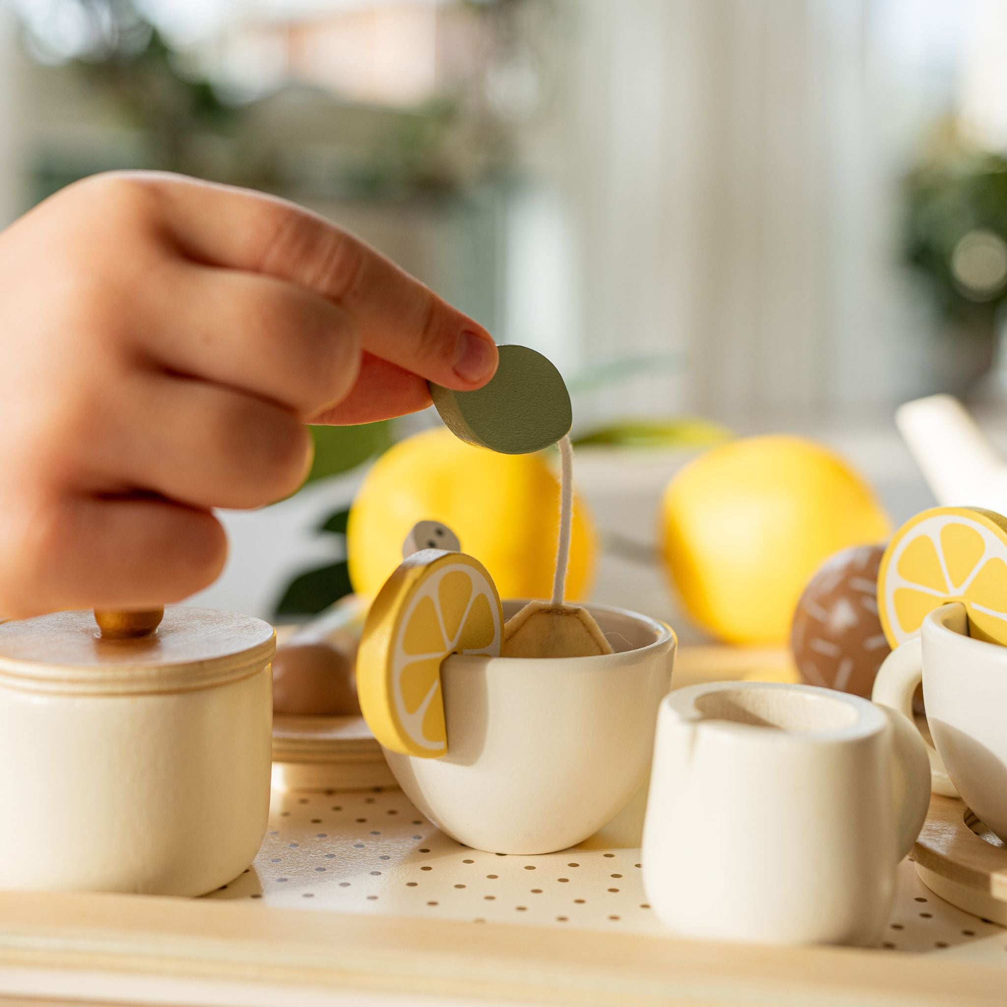 Crafted from wood and decorated with joyful lemon details, the set includes a teapot, cups, saucers, cakes, a tray and all the bits needed for a splendid spread. Each piece is perfectly sized for small hands, inviting children to play, chatter, and create their own delightful tea time traditions.