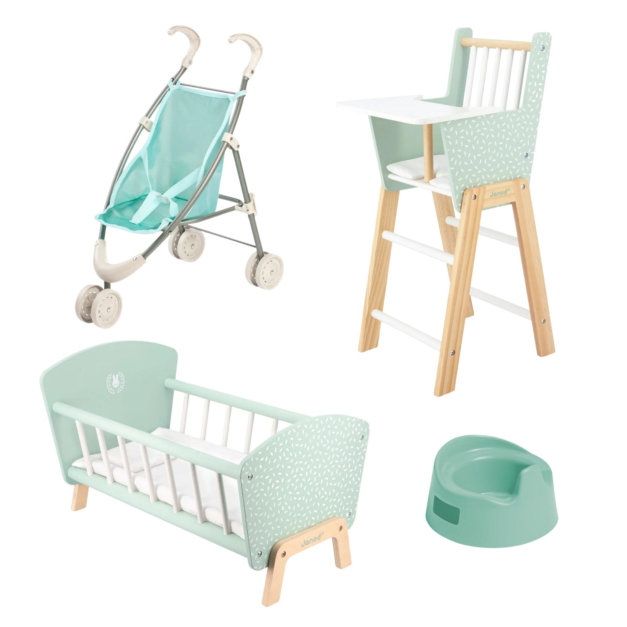 A wonderful bundle of mint green doll accessories. Look after your doll with these essentials. Take dolly for a walk in the three wheel stroller, then it's time for dinner before potty and bed time; tuck your doll in with cosy blanket and pillow included.