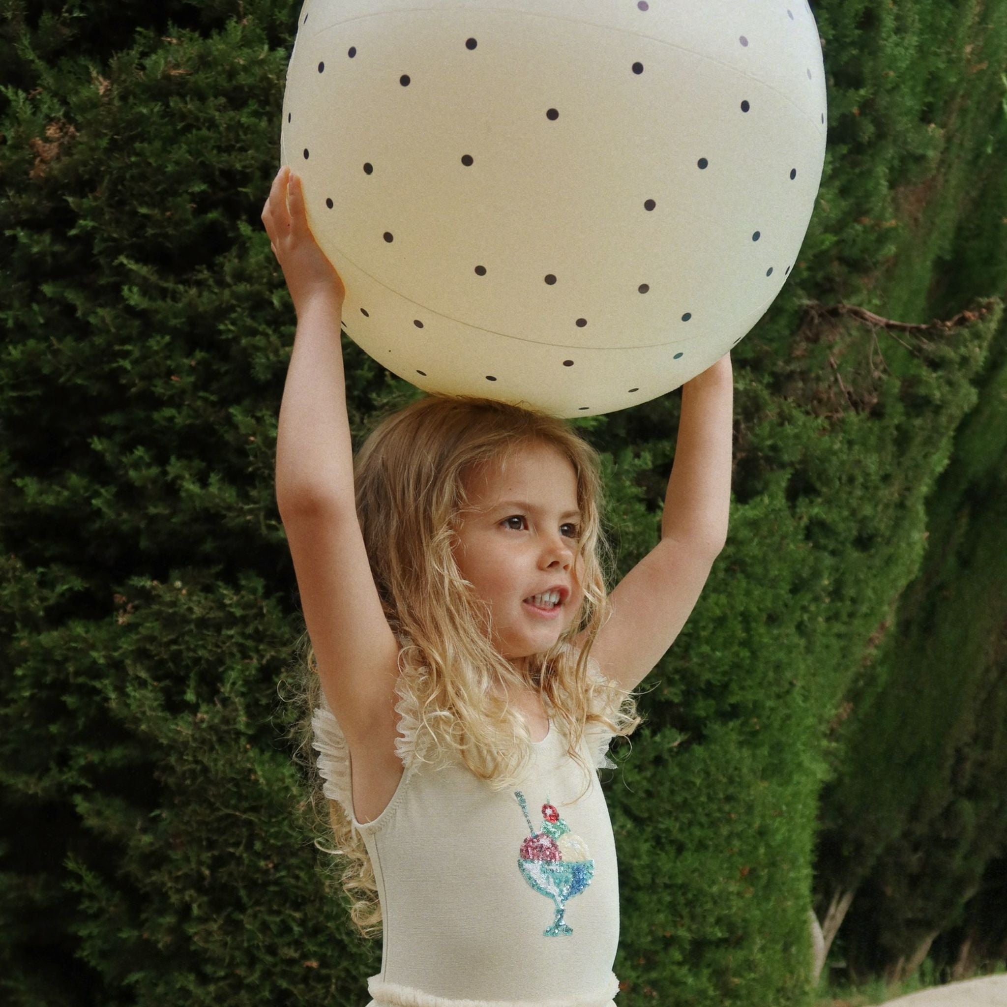 Styled in a charming navy spotted design on a cream base and finished with the signature Konges Slojd cherry motif, it is lightweight, easy to inflate and perfectly sized for little hands to catch and throw. Simple to pack for holidays and days out, it is always ready for fun in the sunshine.