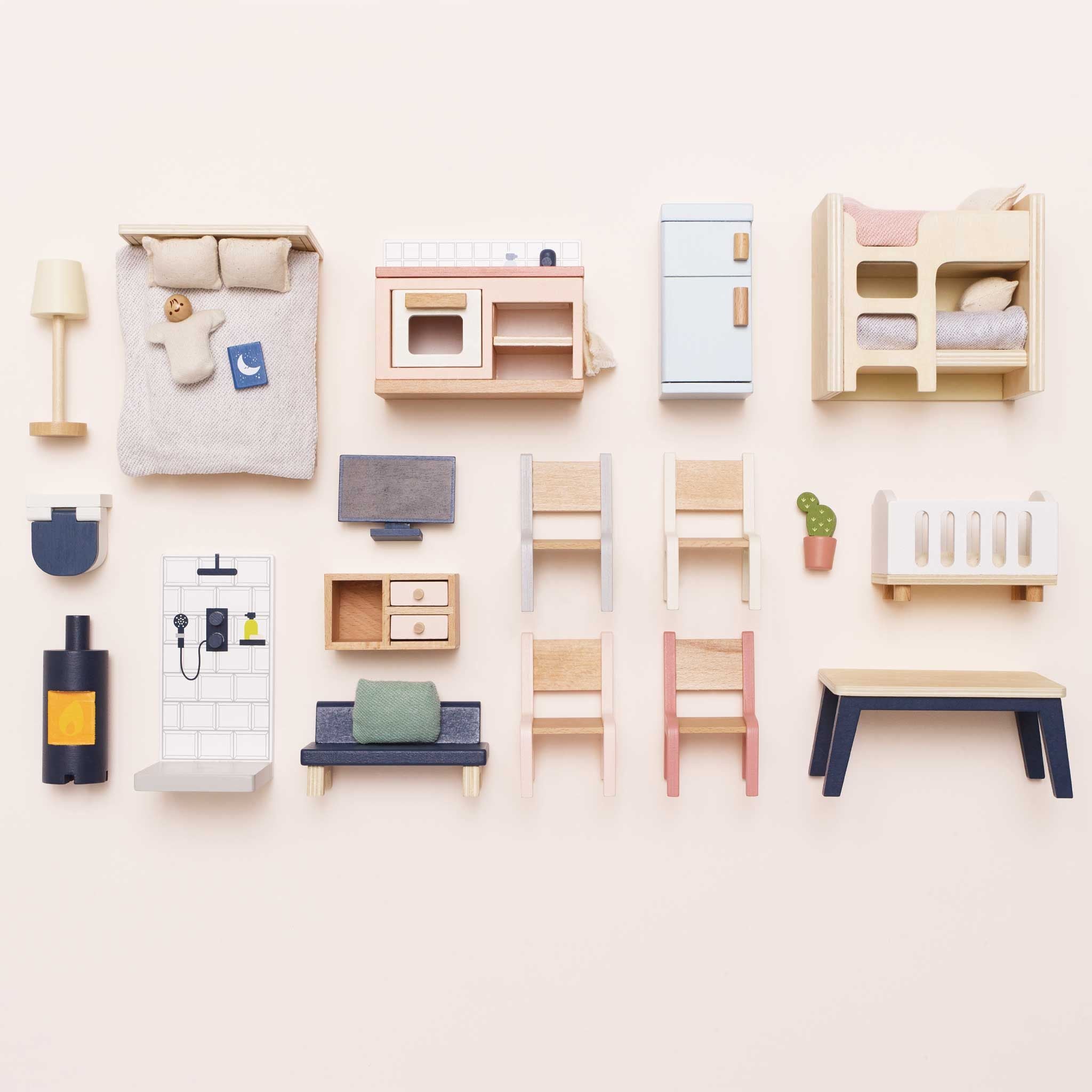 Complete any dollhouse layout with the Le Toy Van Complete Dolls House Furniture Set.