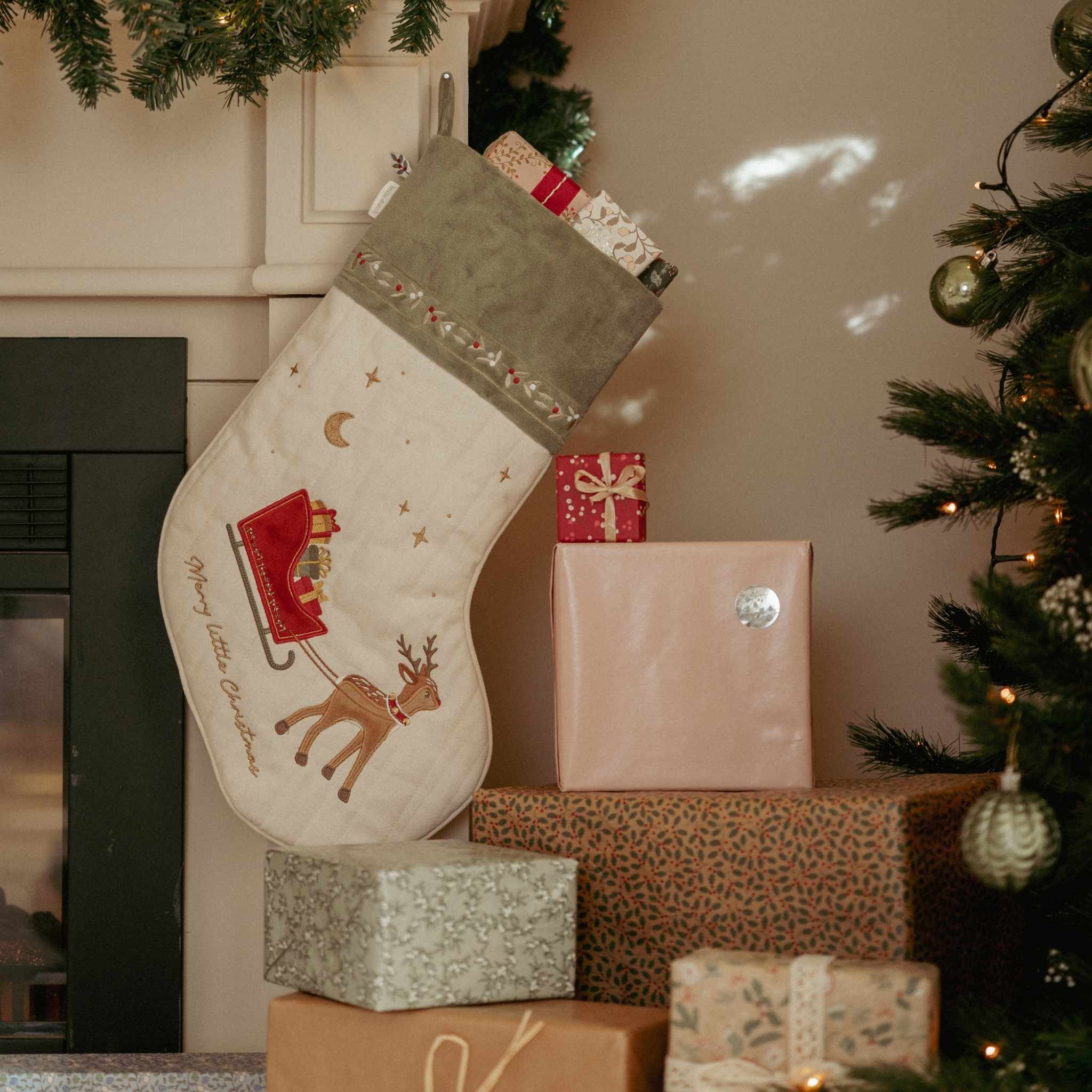 Get into the Christmas spirit and prepare for Santa’s arrival with this beautiful decorative stocking. Perfectly sized to be filled with little surprises and treasures, it features a soft quilted white base, rich green velvet trim and exquisite embroidered detailing of Rudolf pulling Santa’s sleigh through the twinkling night sky.