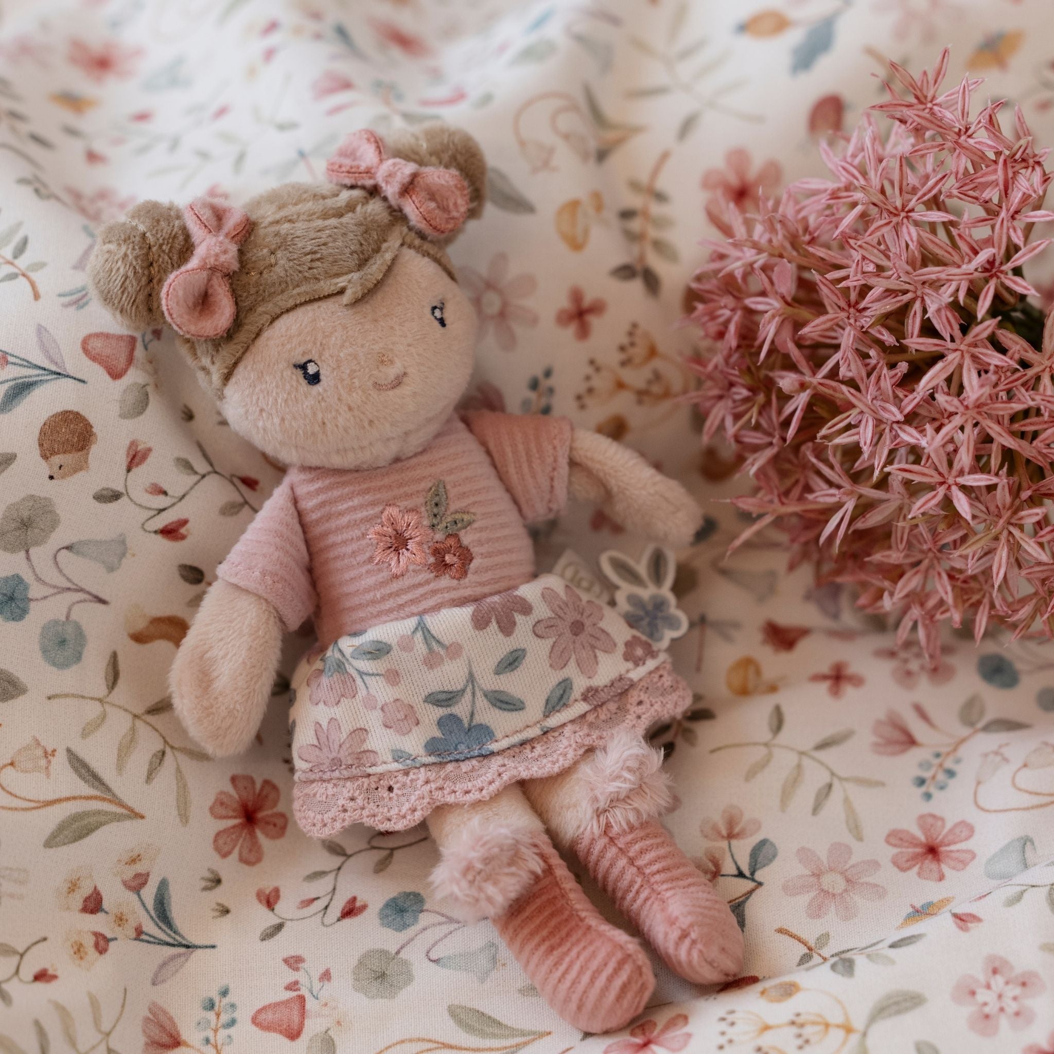 Take a cuddly companion everywhere with you with the Little Dutch Cuddle Doll Rosa 10cm.