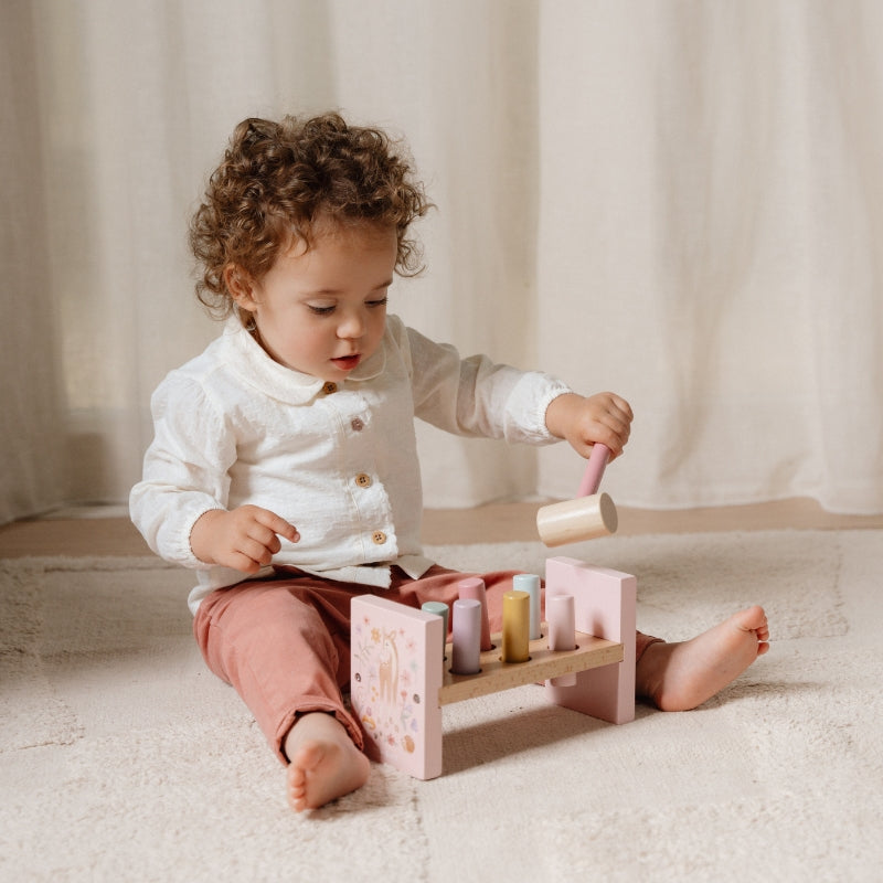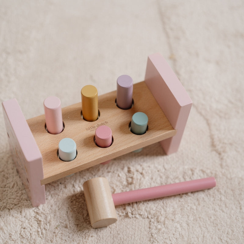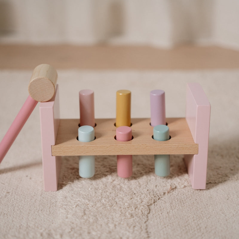 Tap Tap Knock! Use the mallet to pound the 6 coloured pegs into the wooden pounding bench.