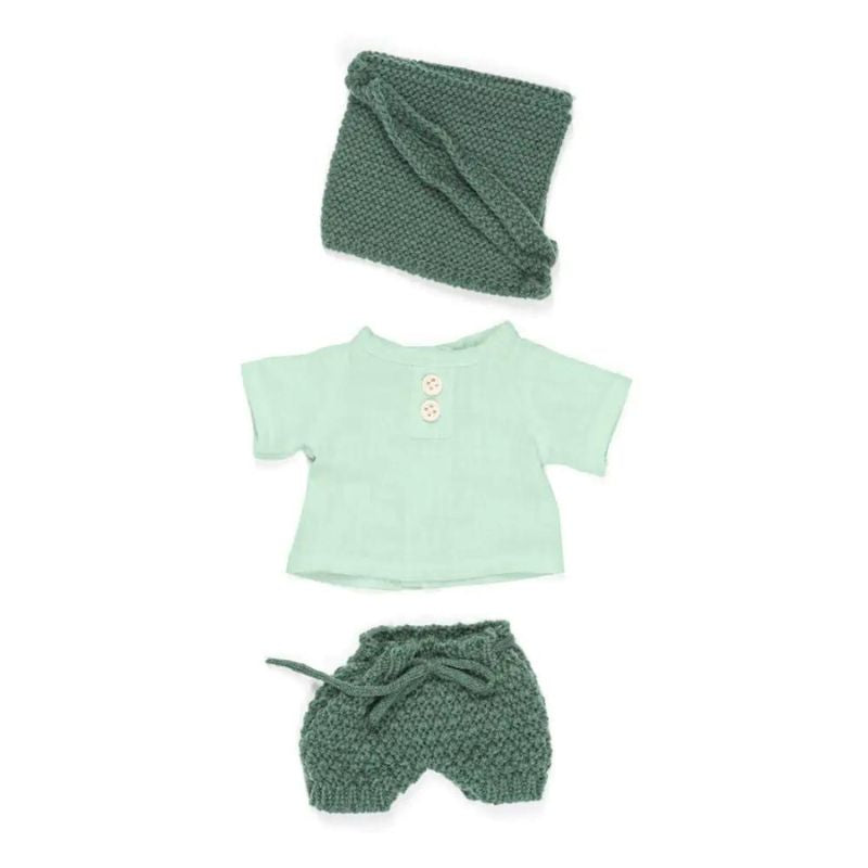 This cute Miniland Forest outfit set with deep green t-shirt, knitted pants and an adorable bonnet is perfect for building up your Miniland doll wardrobe!