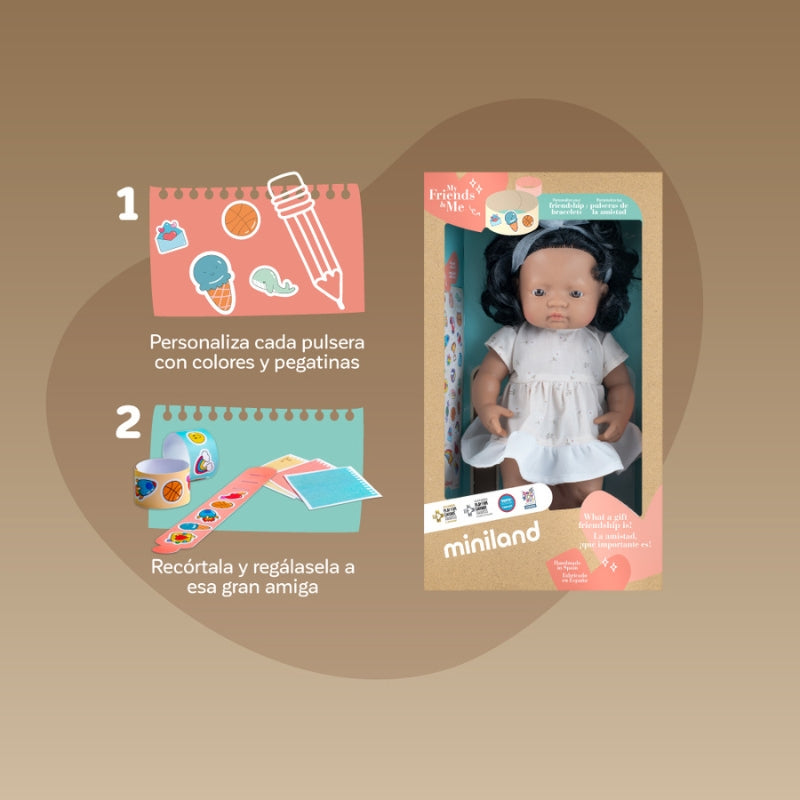 This sweet 38cm doll has hazel eyes, white skin and black long hair wearing a white dress with a blue ribbon. This Miniland doll comes with a handcrafted friendship bracelet, fun stickers and friendship cards enclosed in the sweet doll box.