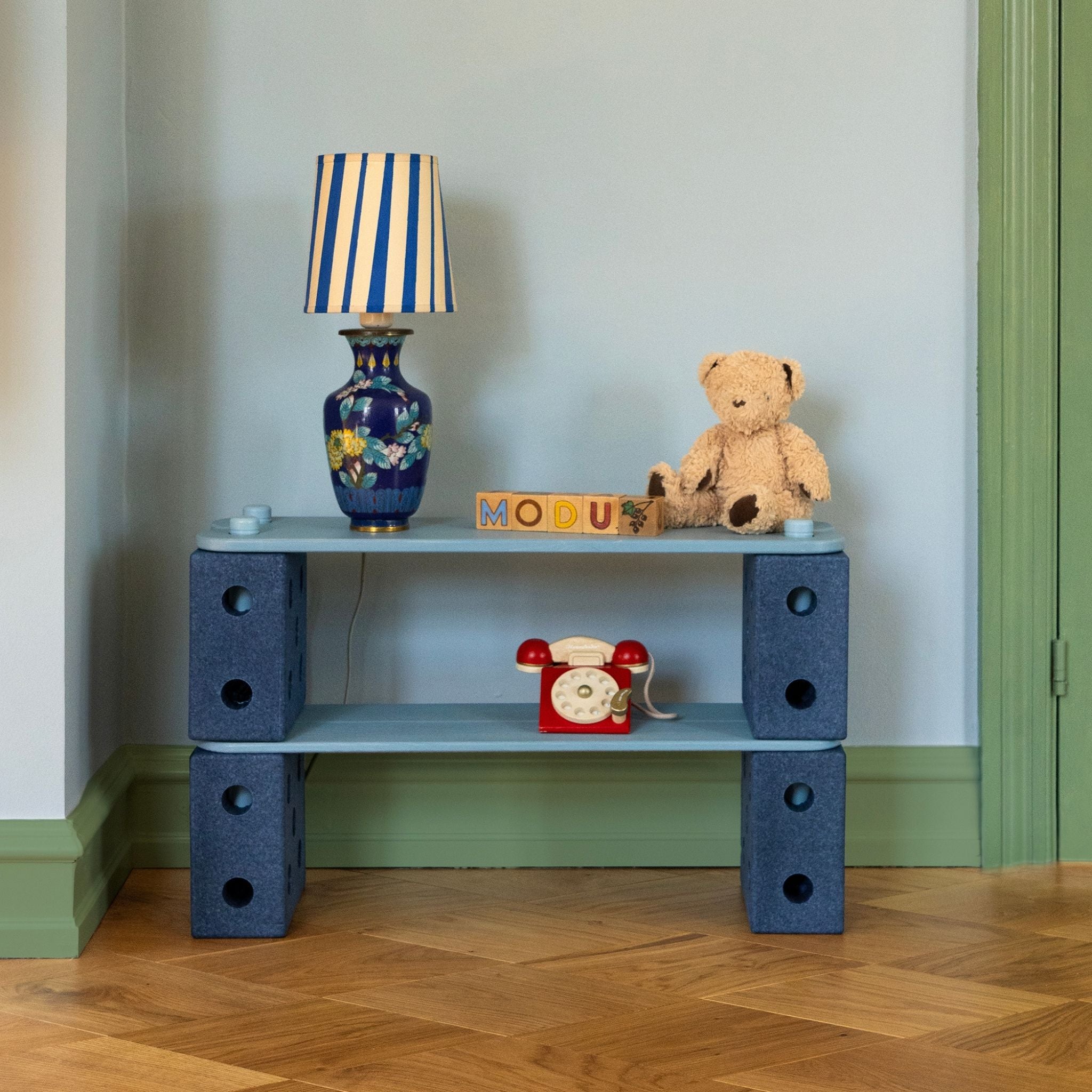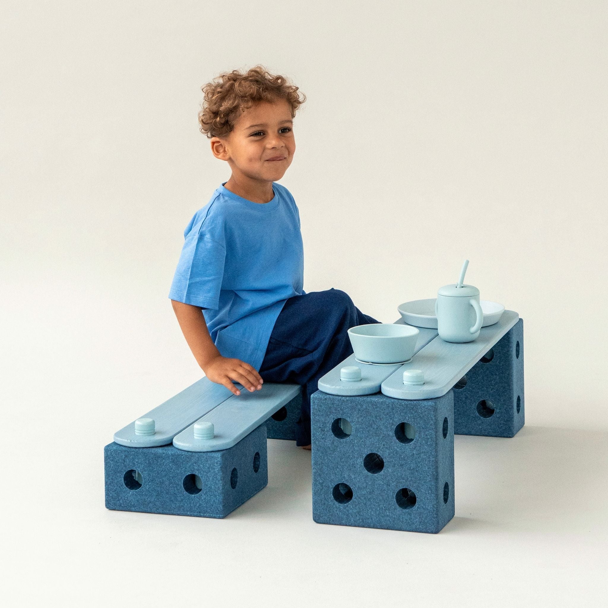 Set includes 17 pieces with 4 deep blue blocks made from 100% recyclable EPP foam, 4 balance beams made from sustainably sourced wood and 8 sky blue pegs made from food-grade ABS.