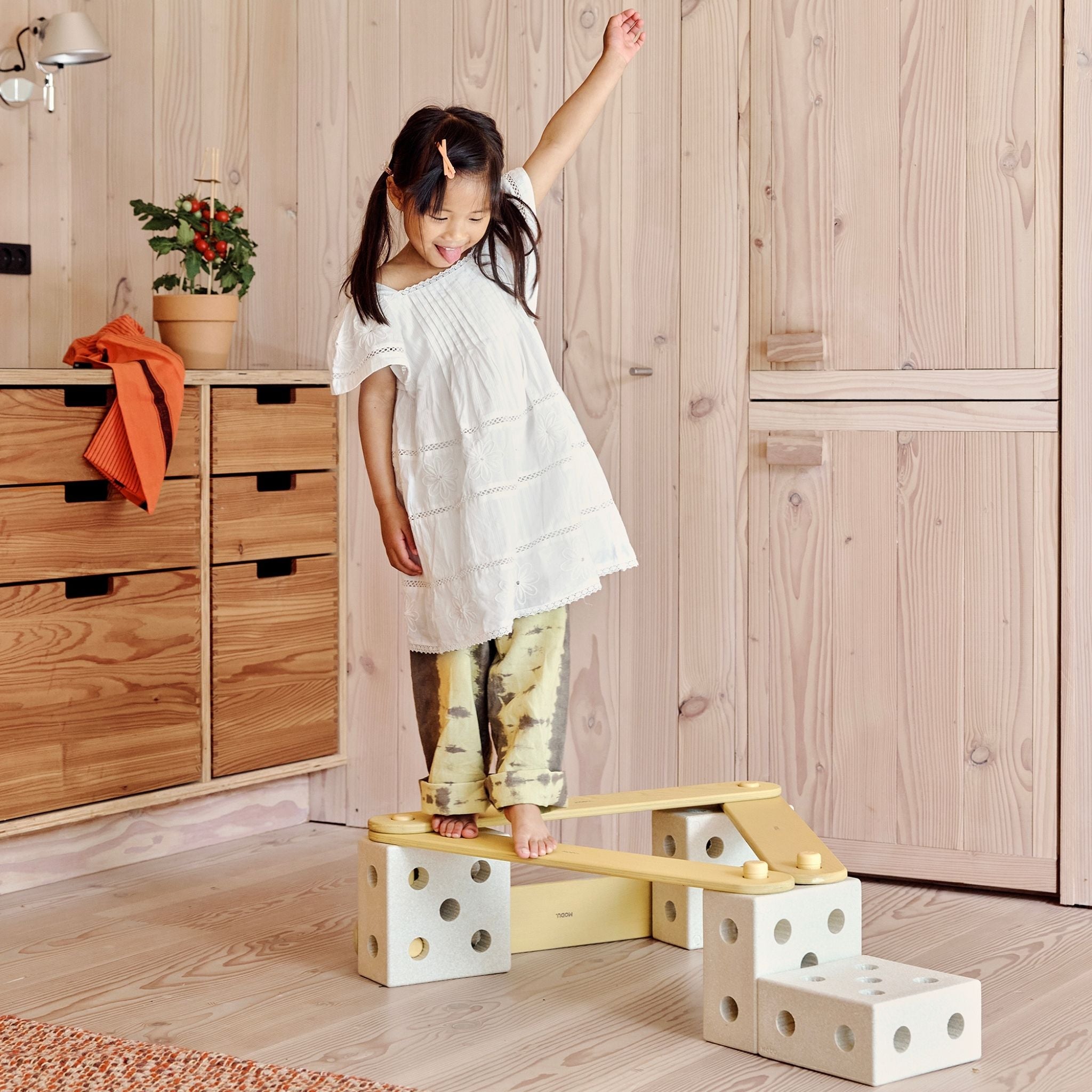 Set includes 17 pieces with 4 sand grey blocks made from 100% recyclable EPP foam, 4 balance beams made from sustainably sourced wood and 8 honey yellow pegs made from food-grade ABS.