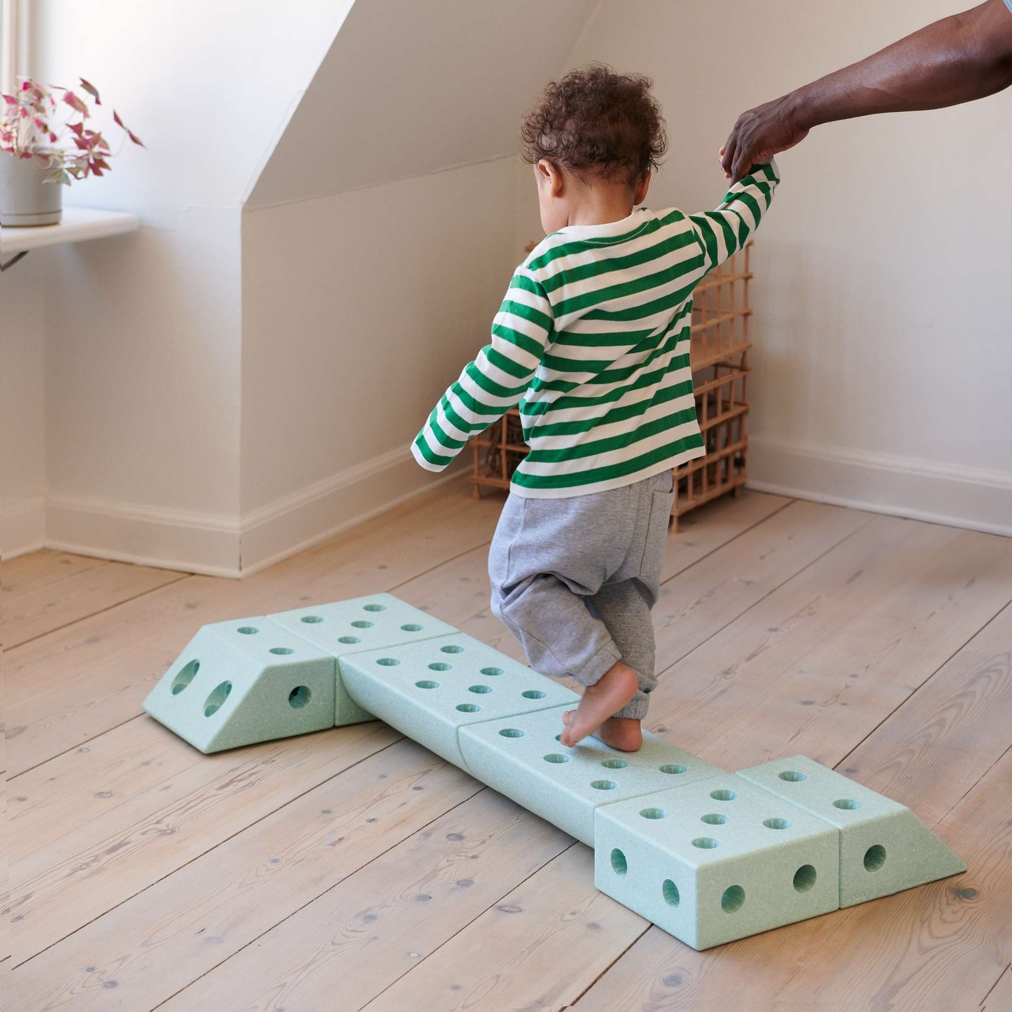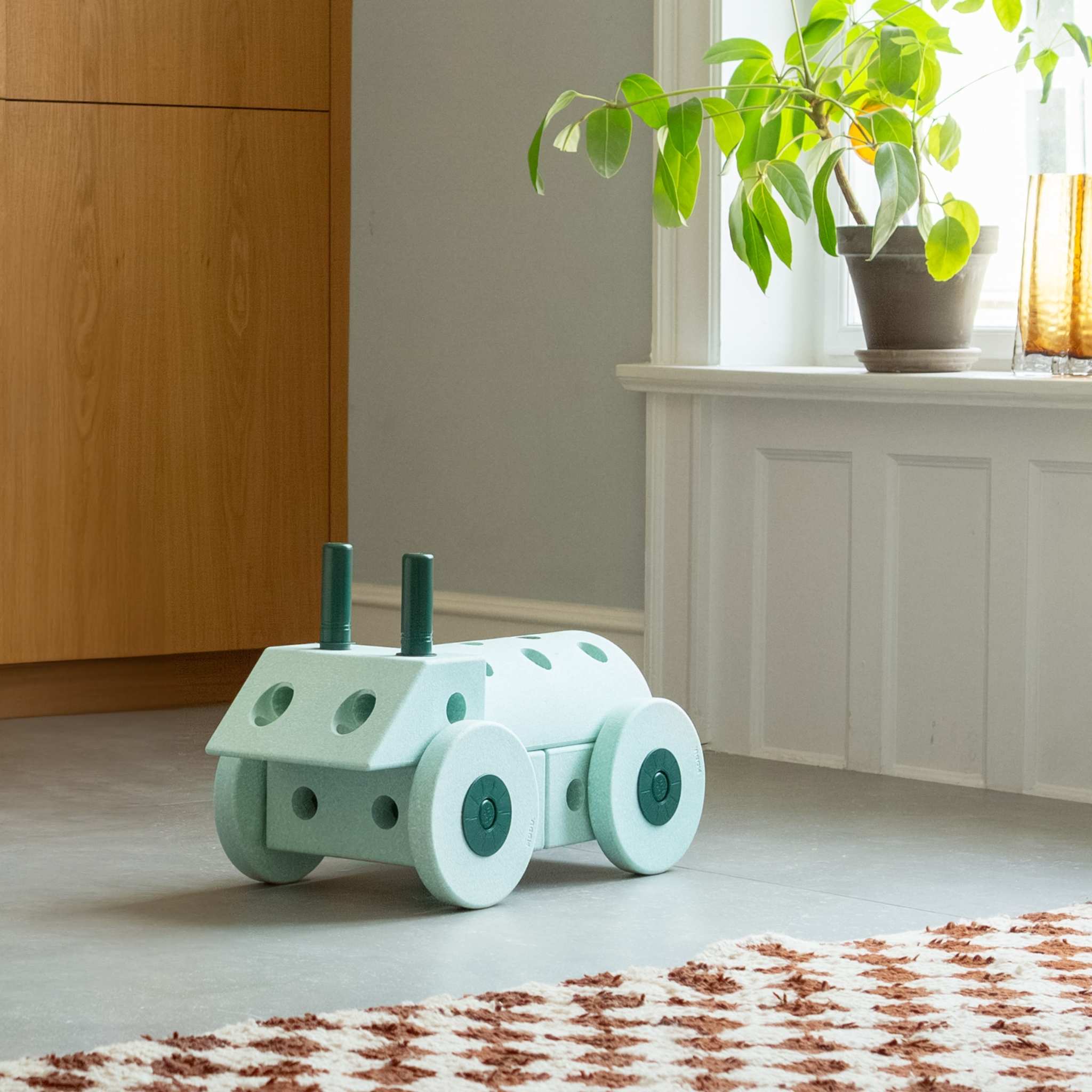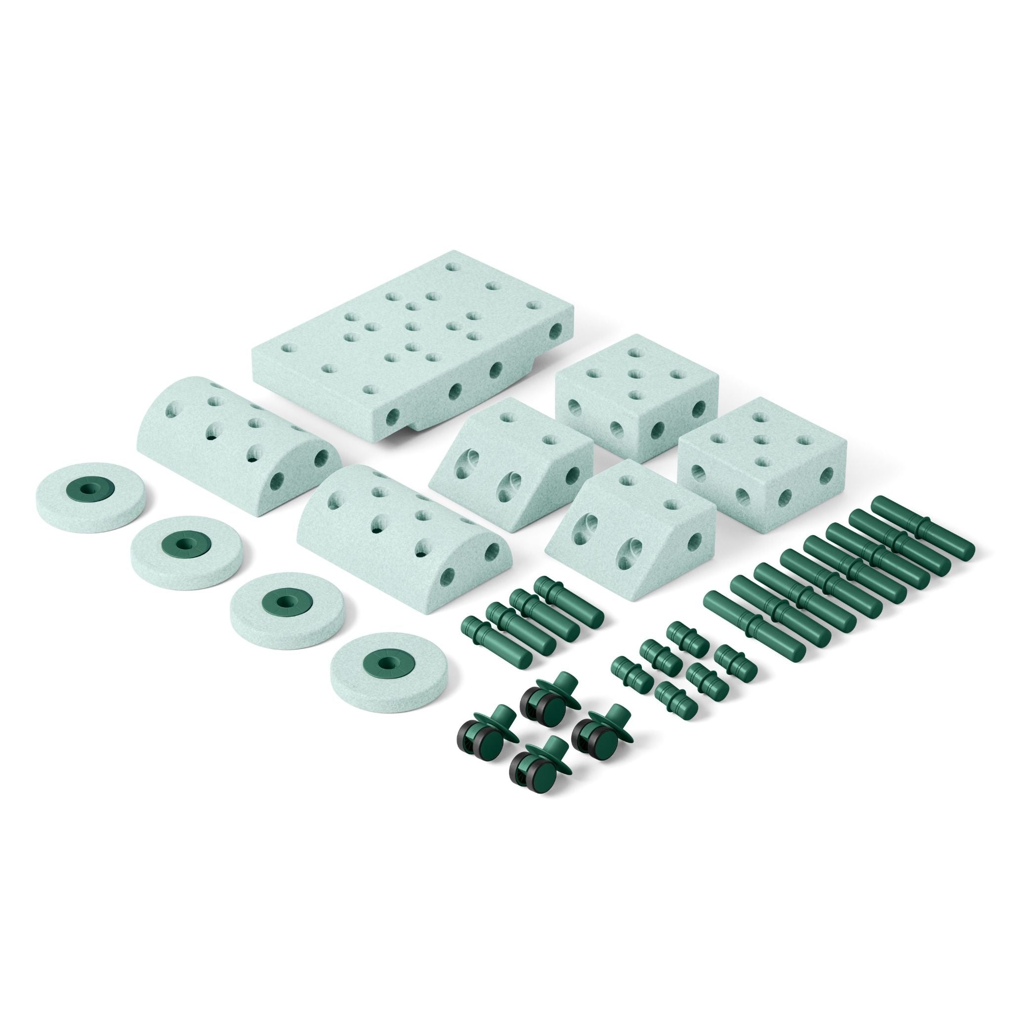 The Ocean Mint Dreamer Set includes 34 pieces with 7 light mint blocks made from 100% recyclable EPP foam and ABS, 18 pegs, 4 swirly wheels, 4 foam wheels, an inspiration booklet filled with over 15 build ideas to kickstart the endless hours of creative fun.