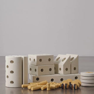 The Sand Grey Dreamer Set includes 34 pieces with 7 light sand coloured blocks made from 100% recyclable EPP foam and ABS, 18 pegs, 4 swirly wheels, 4 foam wheels, an inspiration booklet filled with over 15 build ideas to kickstart the endless hours of creative fun.