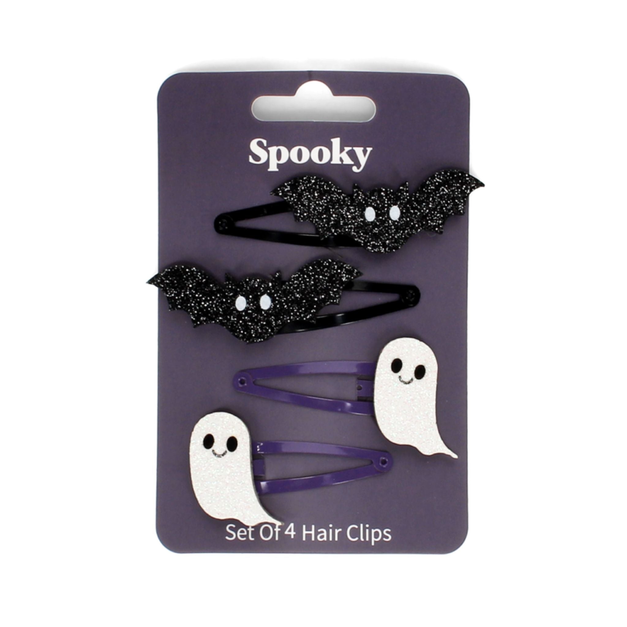 A fabulous accessory for the spooky season or to keep the Halloween spirit going all year round, this set of four clips includes a pair of white ghoulish ghosts on purple hair clips and a pair of bewitching bats on black clips.