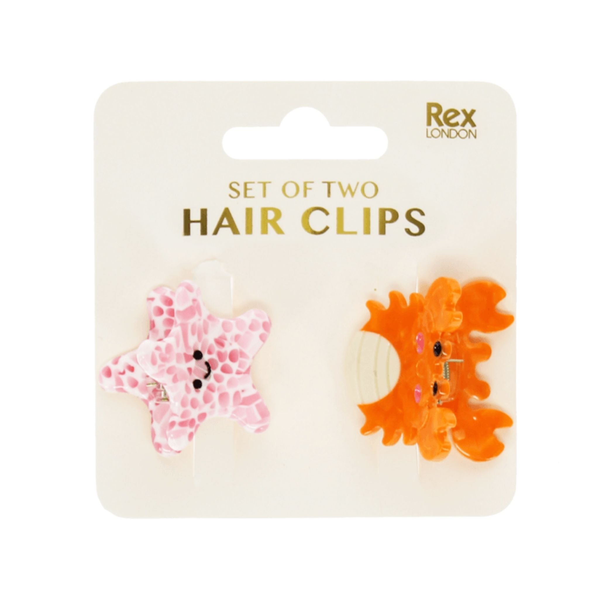 A wonderfully playful underwater touch, this set of two is lovingly crafted from recycled materials. Featuring a delightful marbled pink and white starfish and a lively orange crab, both with a subtle sparkle effect, making them perfect for fabulous hairdos and quick fixes on the go.