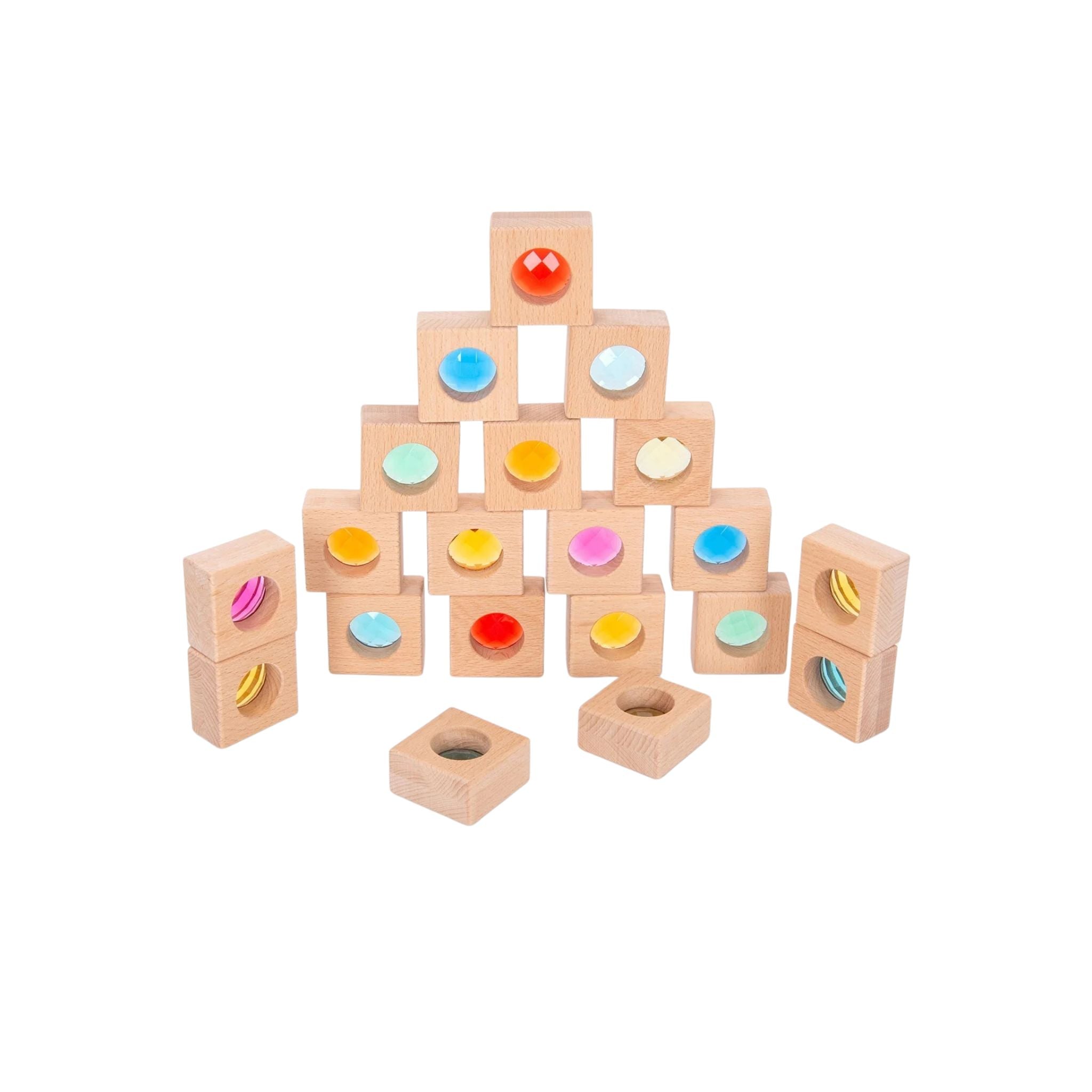 Perfect for open-ended sensory exploration, developing fine motor skills, and encouraging curiosity about colour, light, and symmetry. Ideal for use on a light table, near a window, or simply enjoyed as beautiful building blocks for creative construction play.