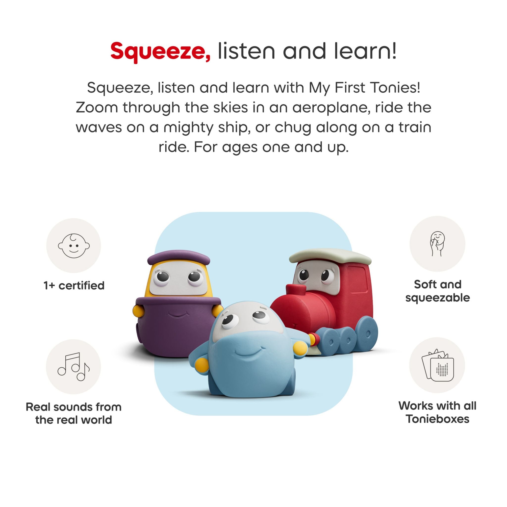 Squish, squeeze and listen to this adorable trio of My First Tonies. Featuring a mighty ship, a speedy train and a brave plane, this delightful travel set is the perfect way for little ones to explore and learn all about different ways we explore our world in a fun, interactive and screen-free way.